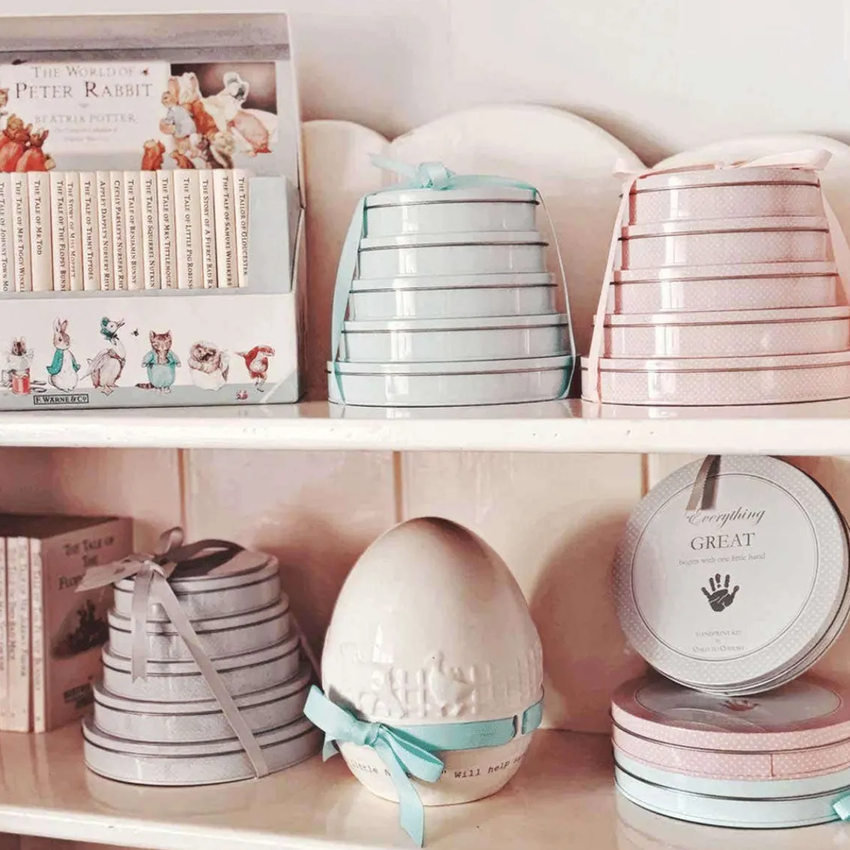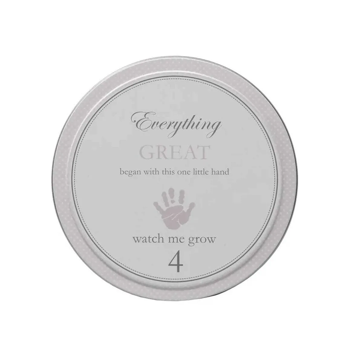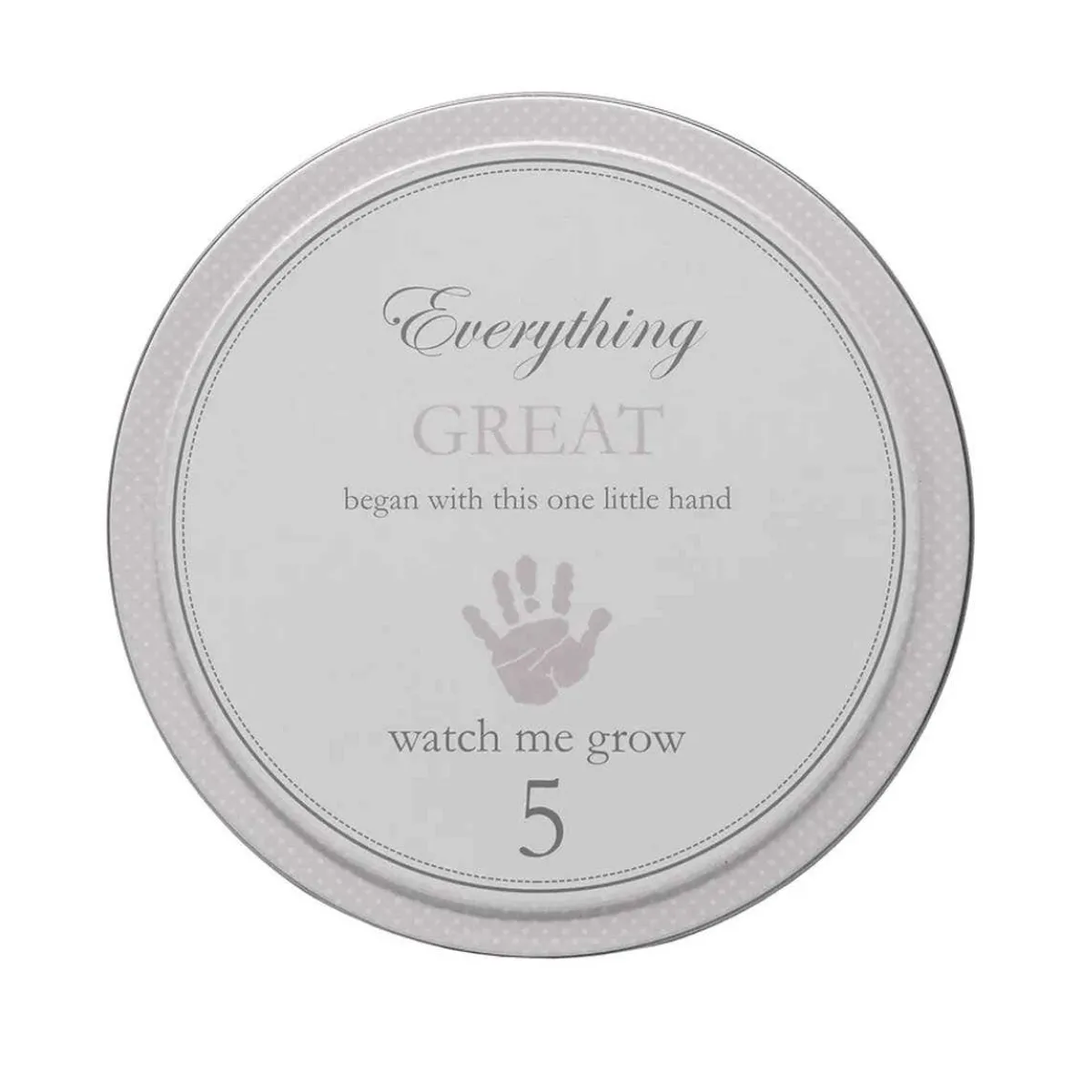 The handprint in the tins are the original handprint kits made with plaster, just add water. 4 inch to 6 inch tins to make your child’s handprint from ages 1-5 years old.
