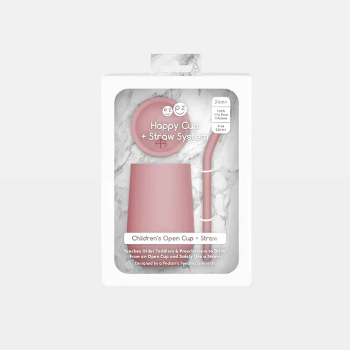 Learning to drink from a straw is an important developmental milestone that develops lip rounding and promotes speech development. The ezpz Happy Cup + Straw System teaches older toddlers and preschoolers to safely drink from an open cup and straw independently.