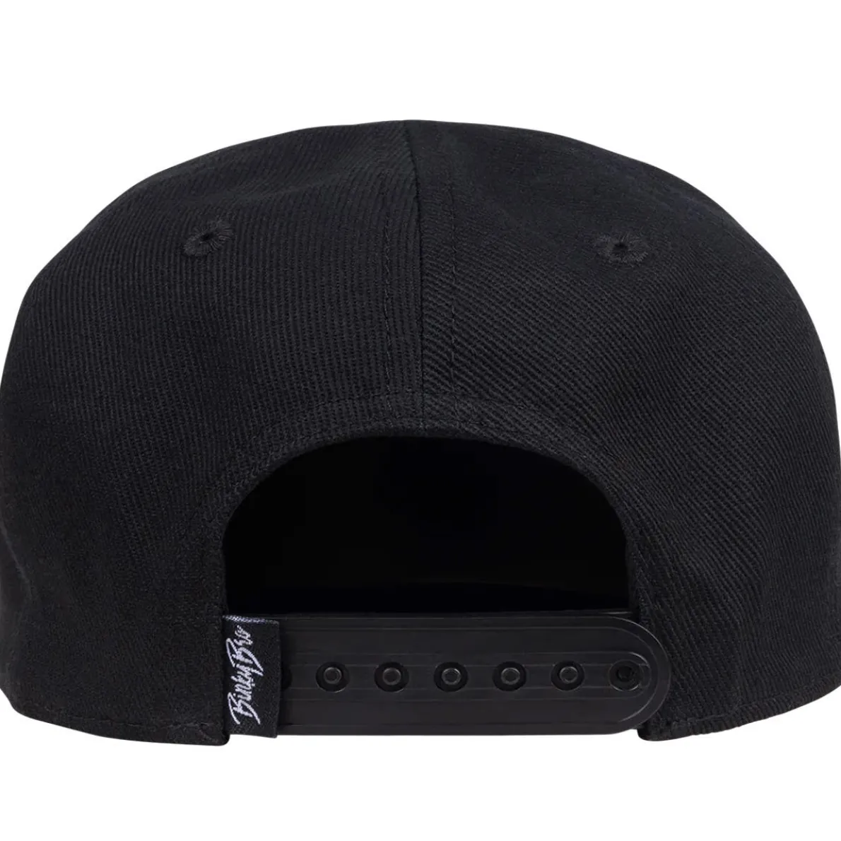 - The Kandui snapback hat has cream paneling, a cream bill, with a cream and black embroidered “Binky Bro” patch on the front.