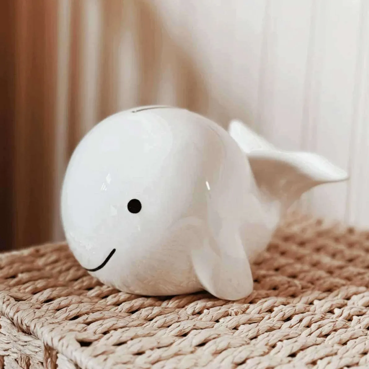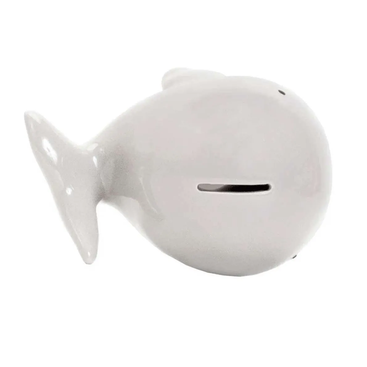 All Child to Cherish banks are made from only the highest quality ceramic, known as dolomite, for increased durability. They feature a base that is deep glazed, insuring that this essential colour doesn’t wear off with repeated handling. To finish things off, they add a shiny finishing that keeps the colours of all of the underlying components locked in place, meaning that you never have to worry about compromising the quality of the bank with repeated use. A charming ceramic bank is shaped like a playful whale sporting a wide smile.