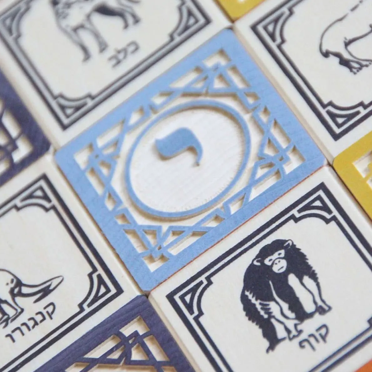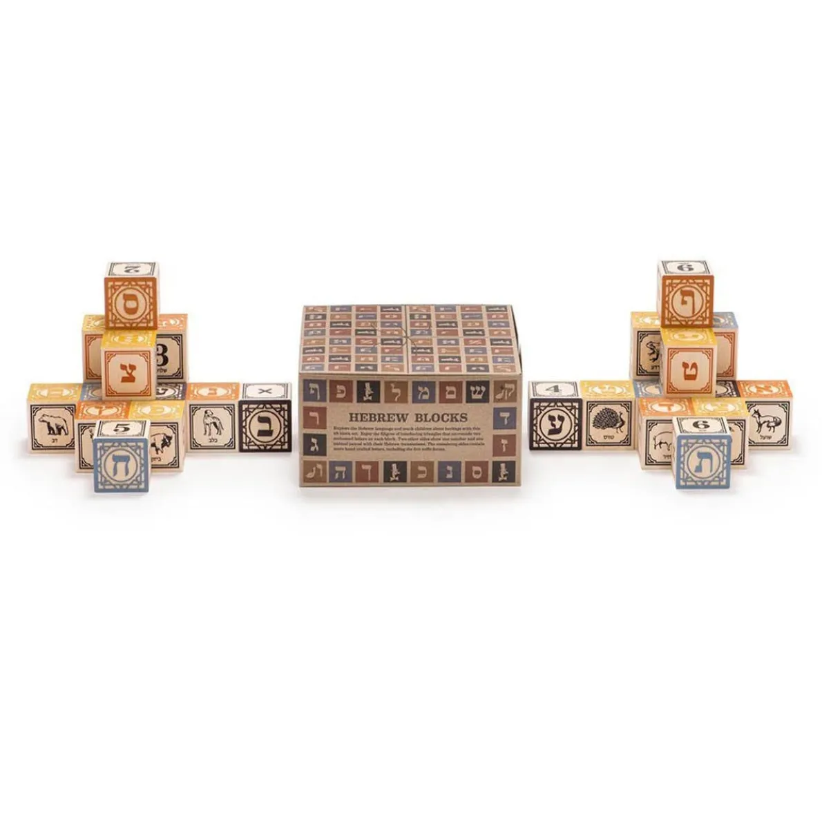 Explore the Hebrew language and teach heritage with this 28 block set. Enjoy the filigree of interlacing triangles that surrounds two embossed letters on each block. Two other sides show one number and one animal paired with their Hebrew translations. The remaining sides contain more hand crafted letters, including the five soffit forms