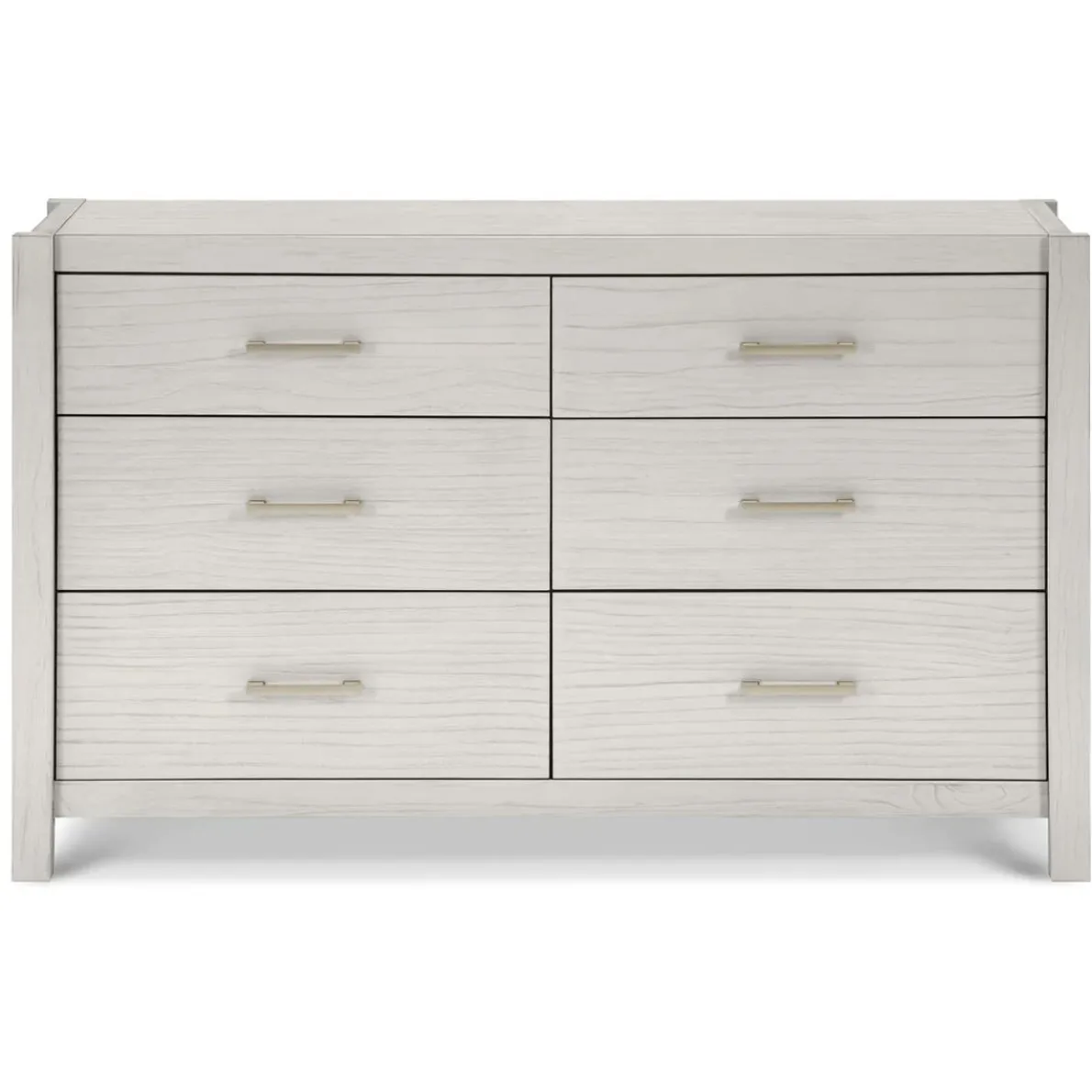 Complete your modern farmhouse nursery with the Hemsted 6-Drawer Dresser, featuring a premium texturized wood finish and elegant gold hardware that enhances the dresser’s contemporary flair. Soft-closing, ball-bearing drawer glides make this dresser easy to use.