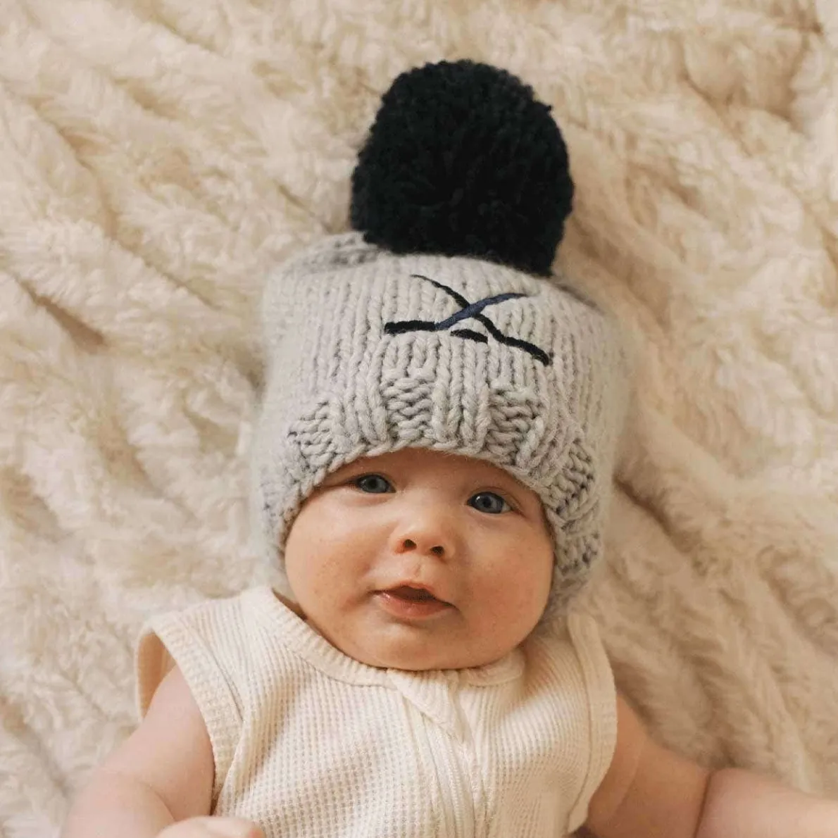 Soft, cozy hat hand knit in thick Ice Grey yarn has embroided hockey sticks and a puck in indigo blue and topped off with an indigo pom pom.