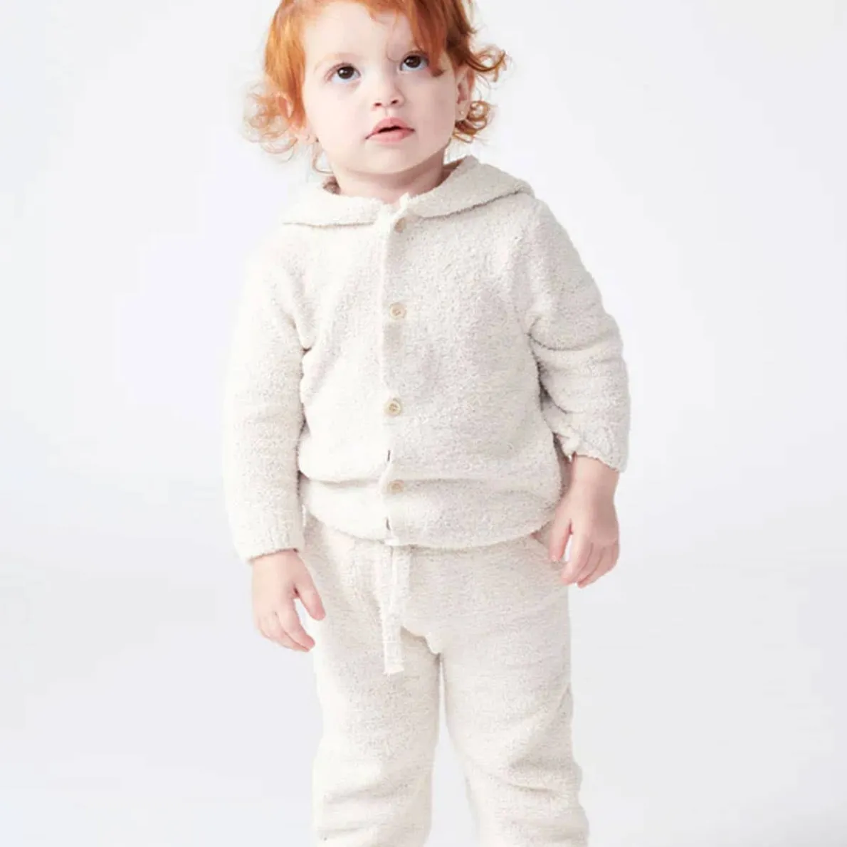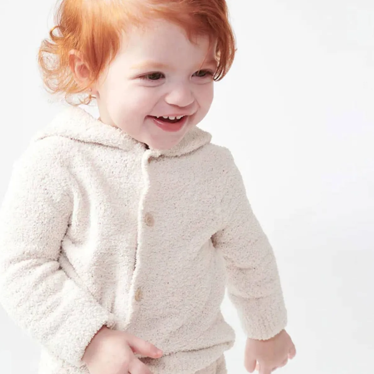 Look cozy, cute and cool in this Hooded Cardigan! Made from supple, 100% recycledmaterials, this unisexsoft fittedsweater is as snugglyas it is fuzzy.Designed for the comfort ofthe littlest of babes!