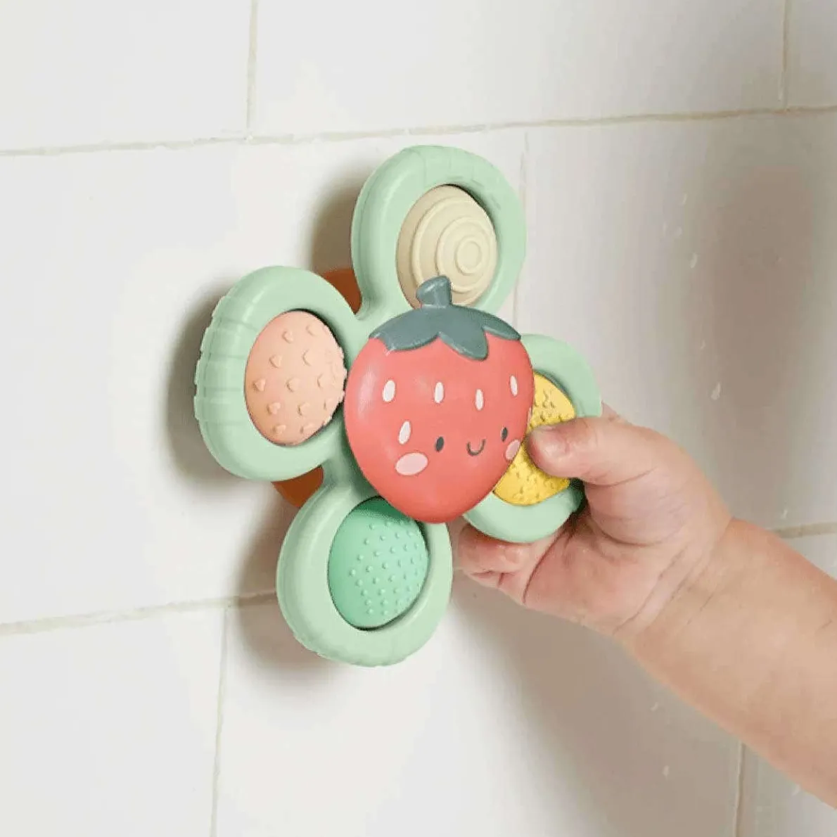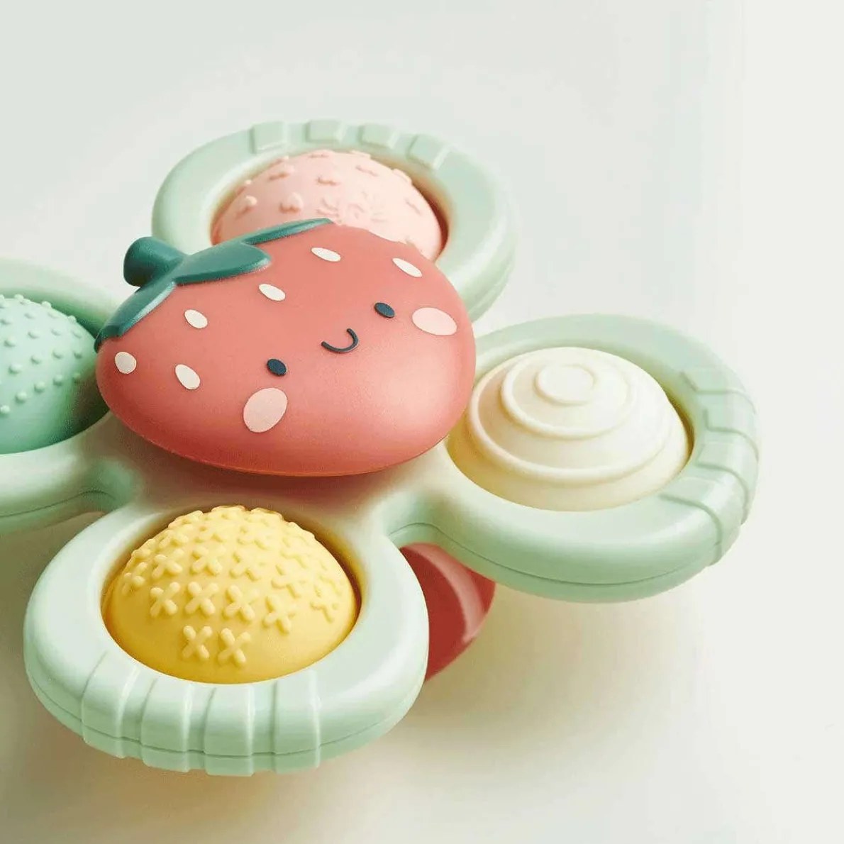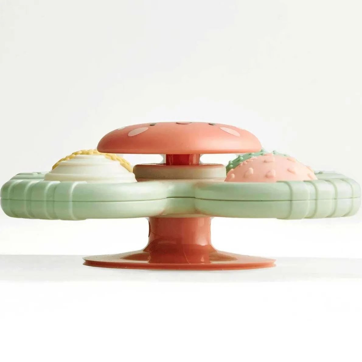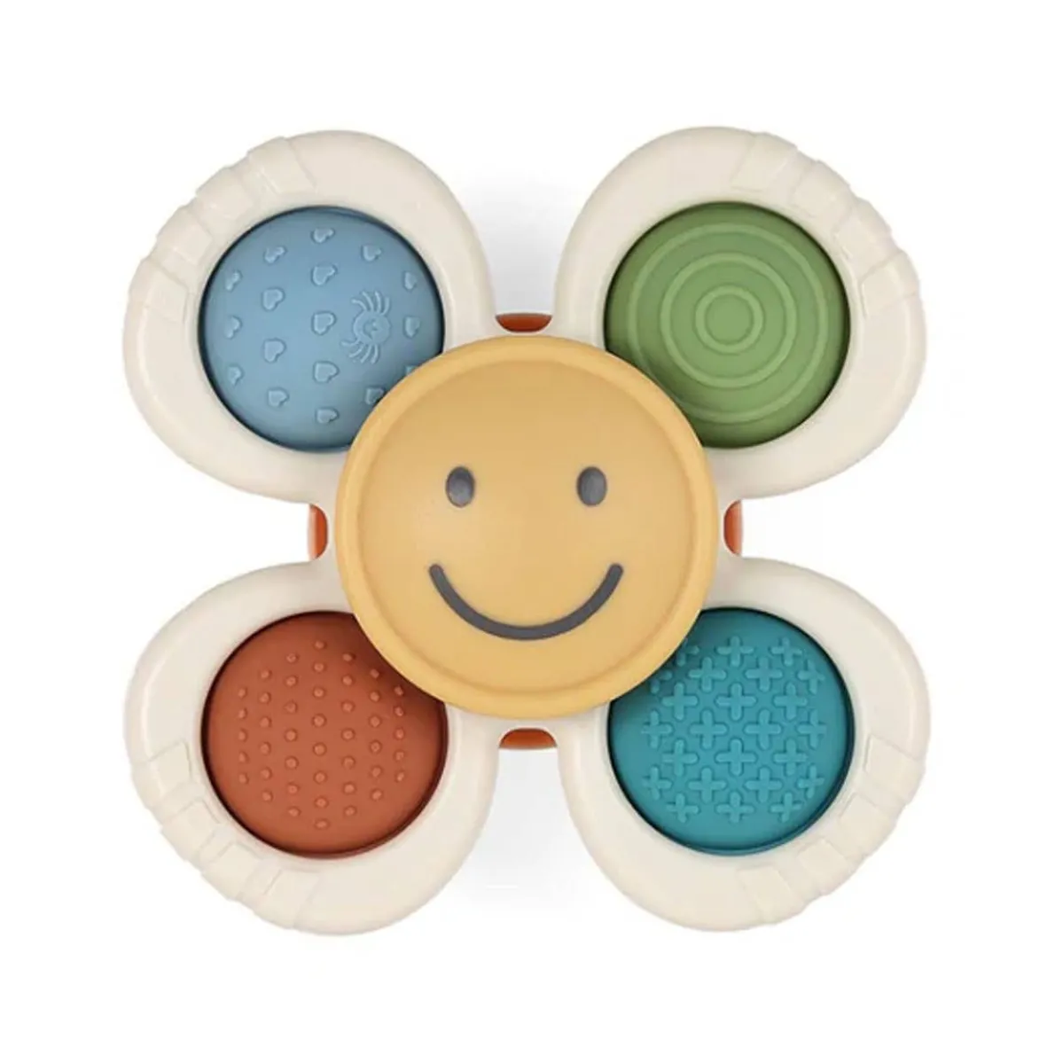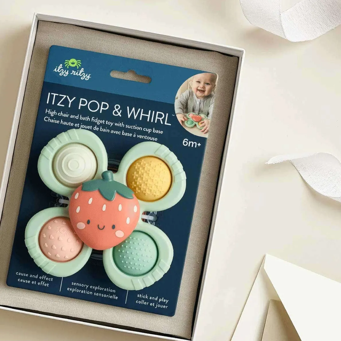 Put a new spin on sensory play with the Itzy Pop & Whirl™ fidget toy. Featuring a suction cup base, it sticks to tables, tubs and other smooth surfaces for sensory play at home and on the go. Four textured silicone poppers engage baby and help build fine motor skills.