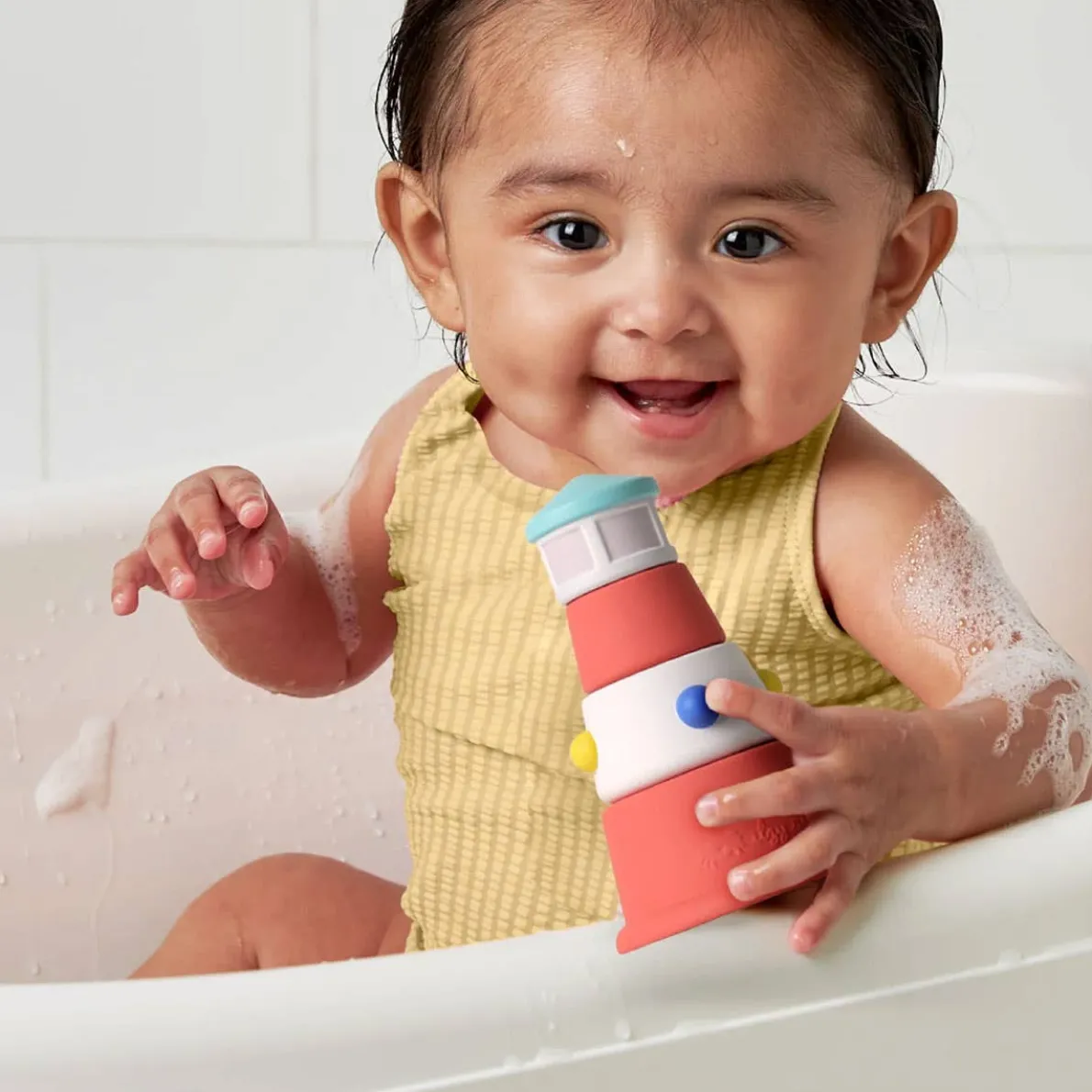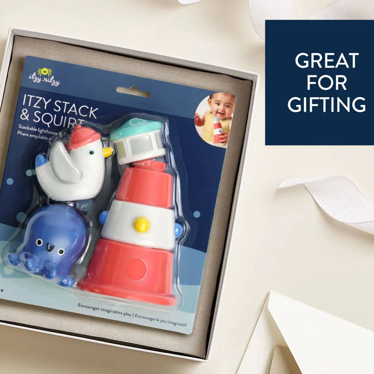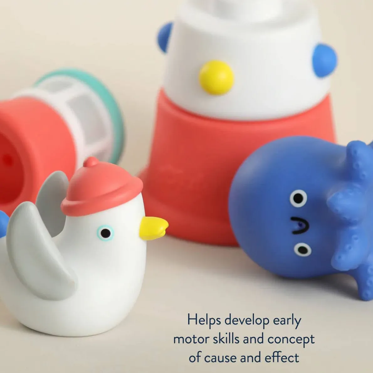 The stackable lighthouse encourages motor skill development and the water-squirting octopus and seagull stimulate the senses. Get ready to set sail for endless bath time adventures!
