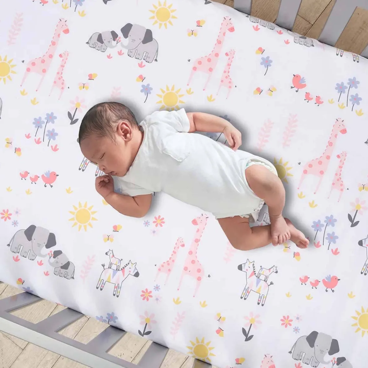 - Breathable 100% cotton fitted crib sheet decorated with mommy and baby animals