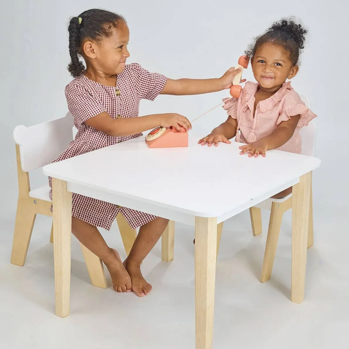 A sturdy and classically simple play table with a bear and rabbit chair included, perfect for children to play table top games, activities, draw and paint, eat a snack, or simply play together whilst sitting down.