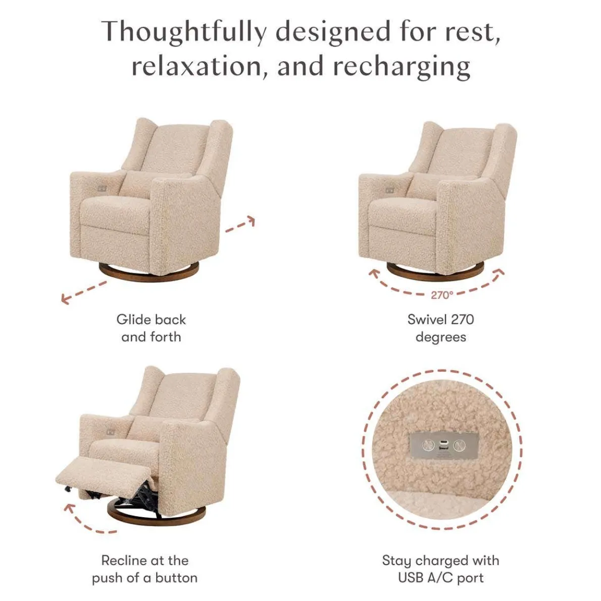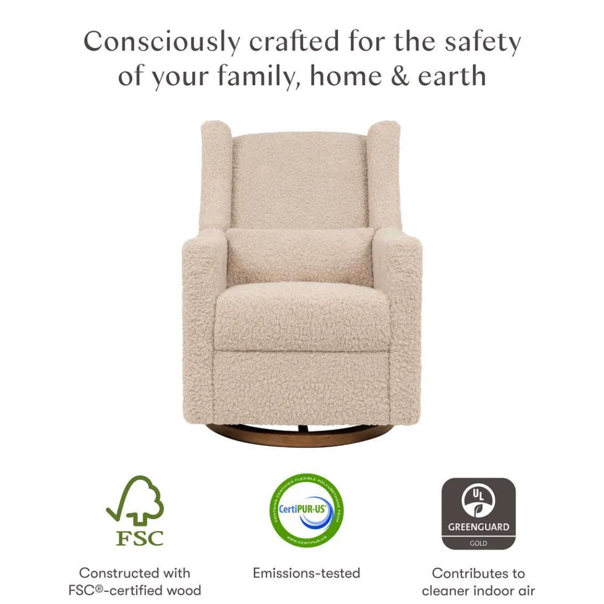 The Kiwi Glider Recliner takes the phrase “rest and recharge” to a whole new level with its built-in USB port, smooth swivel motion, and effortless back and forth gliding motion. Lean back and kick up your feet at the touch of a button with this recliner’s quiet electronic control button. It’s a stylish choice with a modern wingback design but also a more sustainable choice for your home. Upholstered by hand in eco-performance fabric, that is stain resistant, water repellent, and made with at least 30% recycled yarn.