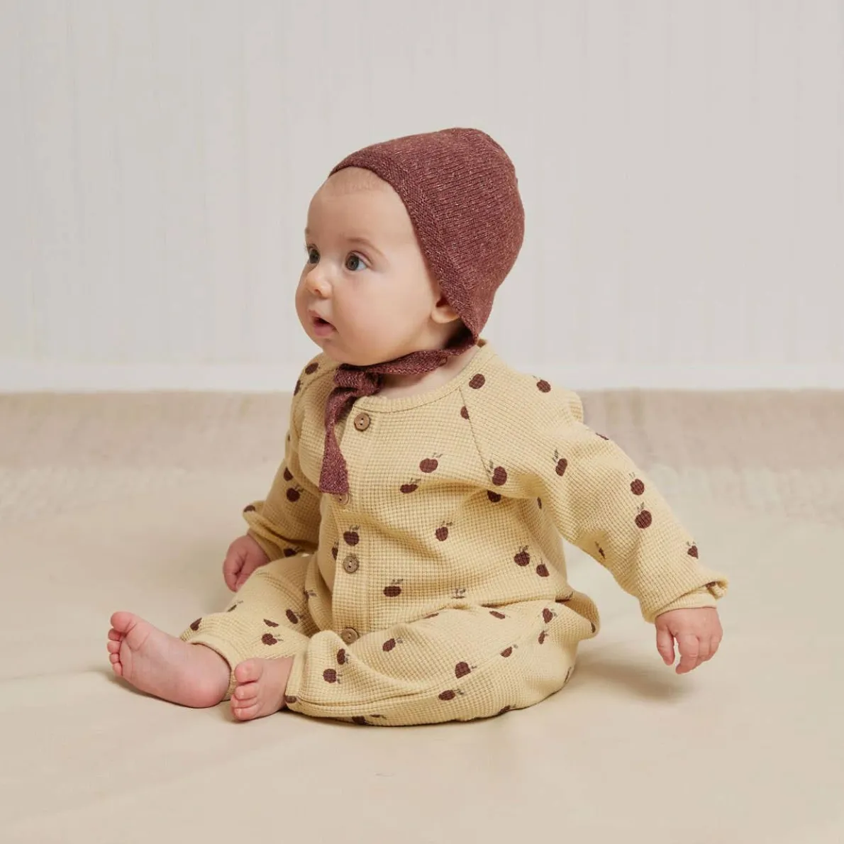Organic cotton sweater knit bonnet hat with ties at chin.
