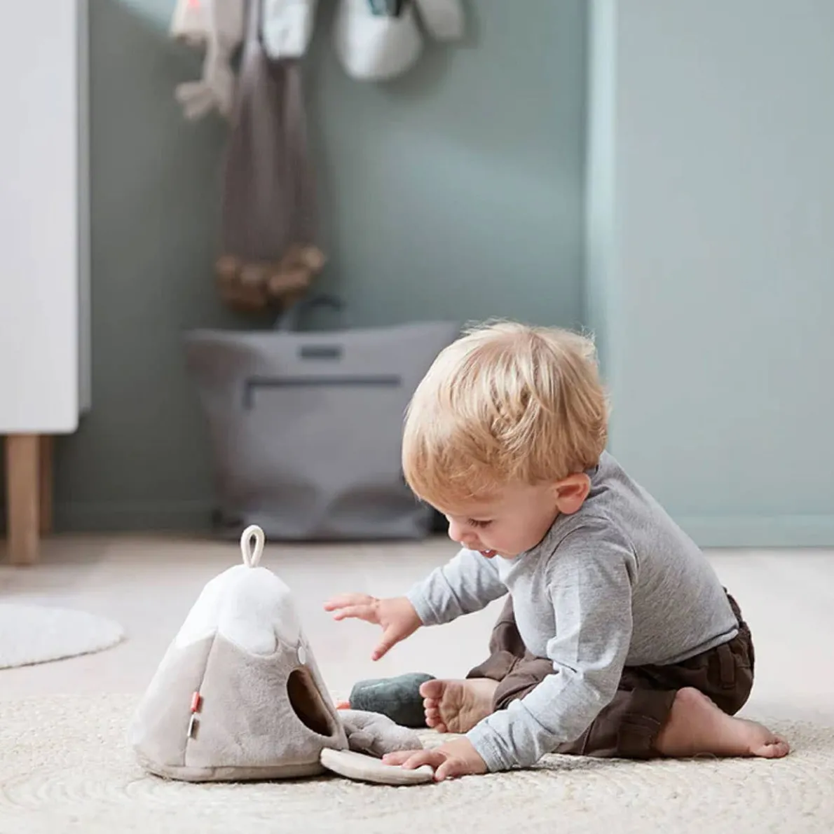 The hide and seek mountain and the small activity toys are in soft shades of sand, blue, green and a splash of coral red.