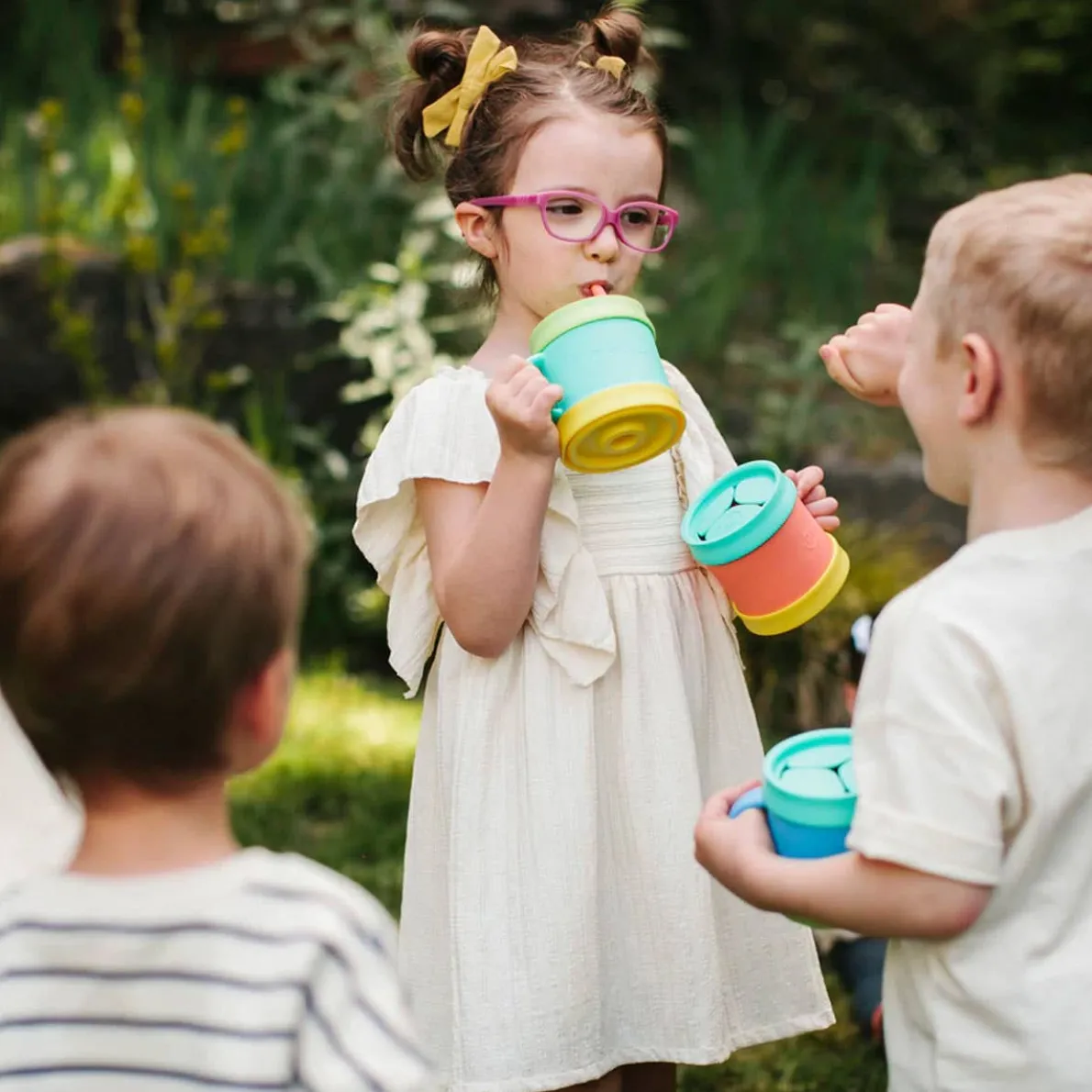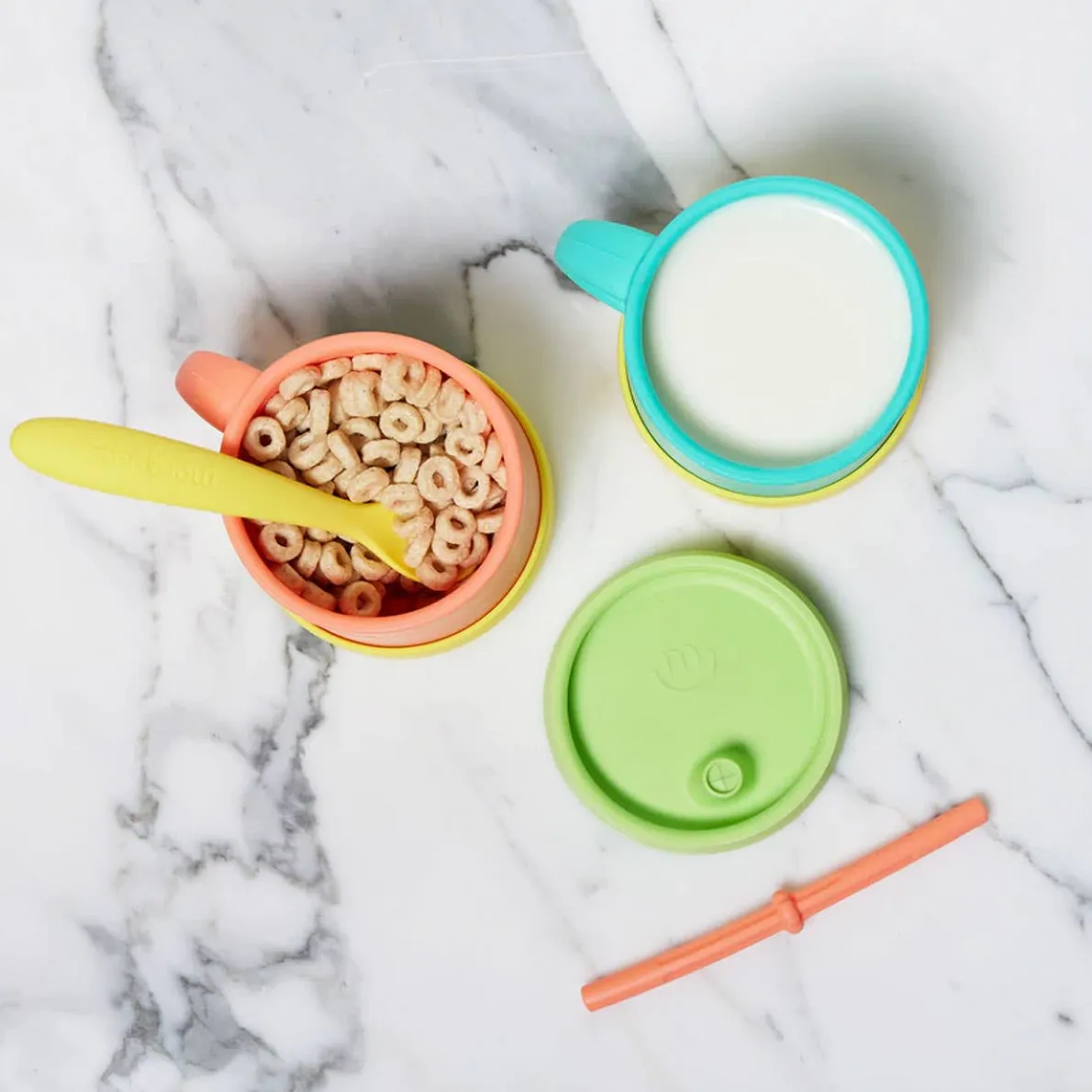 This sippy + training straw is compatible with the morepeas Essential Snack Cup. Simply remove the snack lid and replace to transform from snack cup with sippy. The top lid reverses as a weighted suction base to add stability for straw-training and reduces the chance of spills. As your child grows (or when using the sippy spout), you can flip the suction lid to a flat base. It can also be used to store our straw for on-the-go, keeping it clean and secure in your diaper bag. The training straw has a middle stopper to prevent your child from removing it, making it the best sippy and straw cup for your little one.