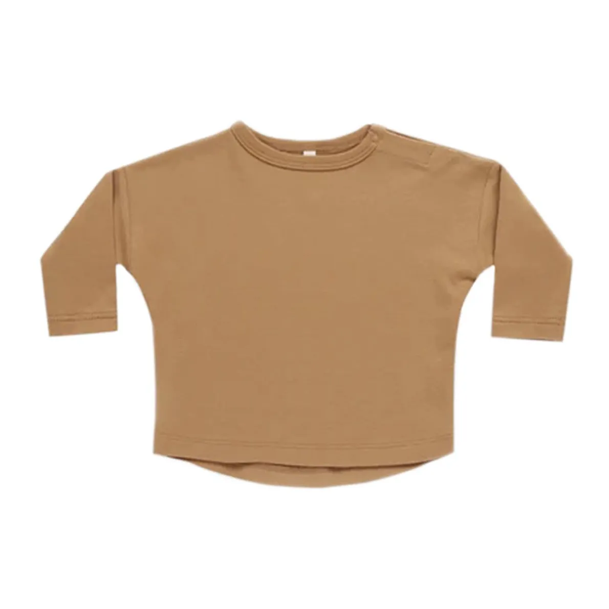 Long sleeve baby tee made of velvety soft organic brushed fabric. Sizes up to 18-24m have a snap at the shoulder for easy changing.