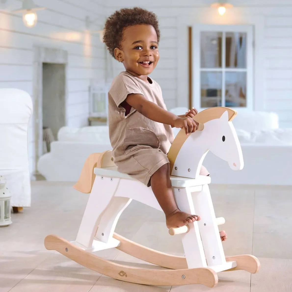 Gallop through the snowfields on your lucky horse. A premium rocking horse inspired by the classics. A traditional and essential toy for the nursery or playroom. Simple and chic, painted in white with details in wood.