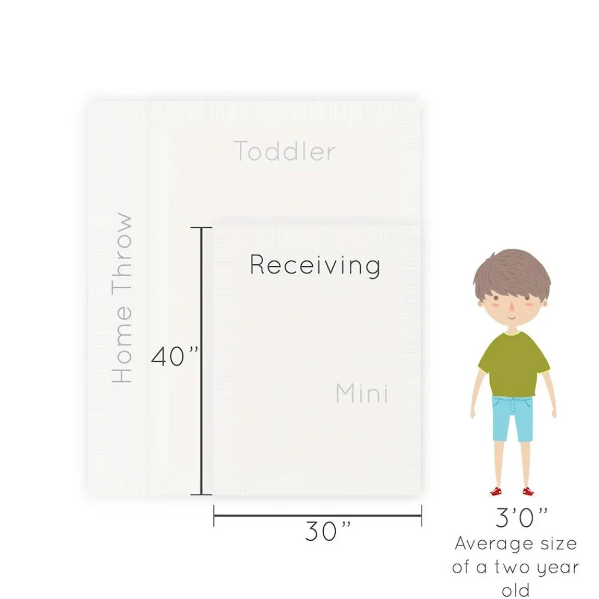 - Receiving blanket: 30″ x 40″ – Large enough for babies and infants in their first several years.