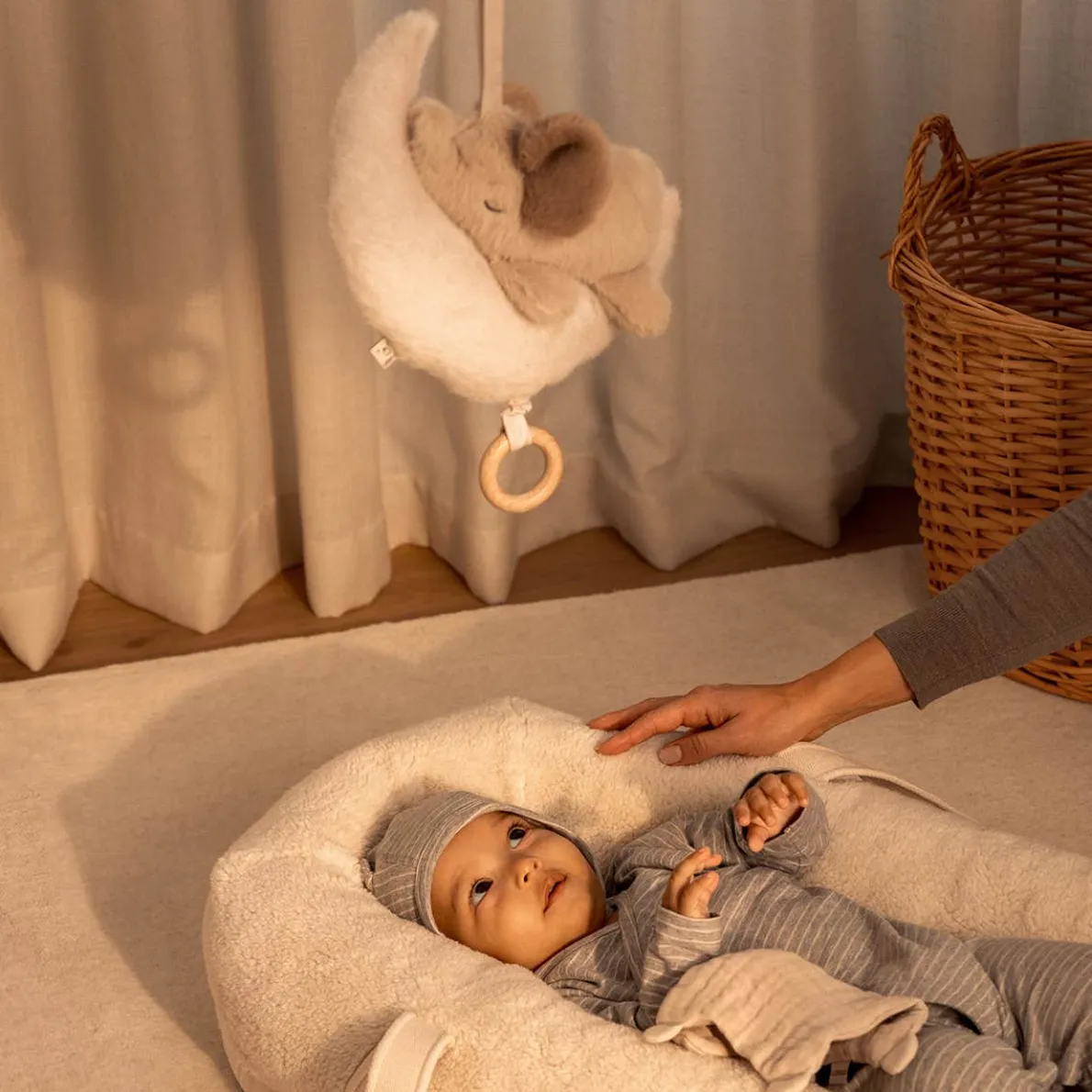 Soothe your little one to sleep with the Mandy Baby Elephant Music Mobile. Featuring a tiny elephant snoozing on a crescent moon, it gently plays Brahms’ Lullaby when you pull the wooden ring. Made from ultra-soft GRS-certified recycled materials, it’s a dreamy addition to any nursery.