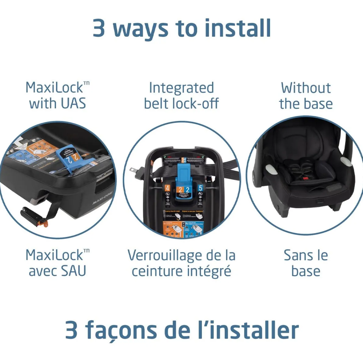 The intuitive base installation features MaxiLock™ technology with red-to-green tightness indicators, a 3-position adjustable base, a self-tightening UAS system, and a load leg which adds stability and limits movement in the event of a collision. Taxi-mode is simple and convenient with large, visible belt guides that show how to position the belt without using the base.