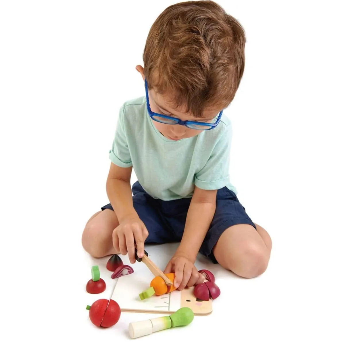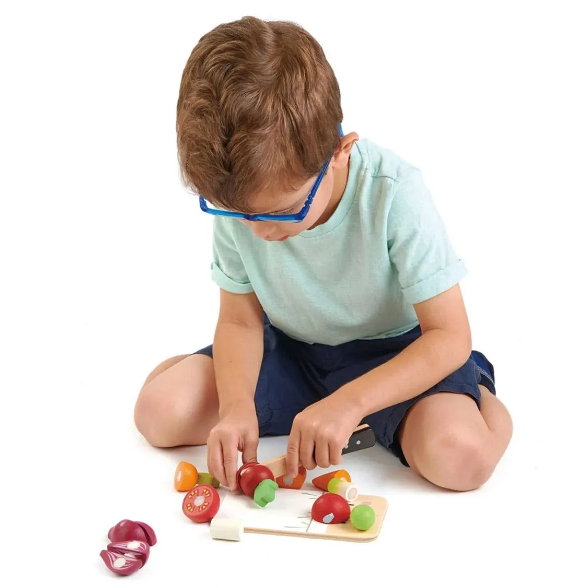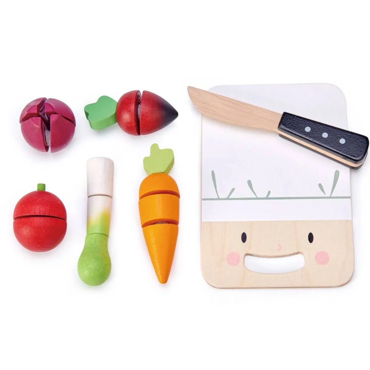 Mini chef chopping board. Wooden knife, carrot in 3 parts, beet in half, tomato in half, onion in 4 parts, scallion in 3 parts. Chop chop chop!