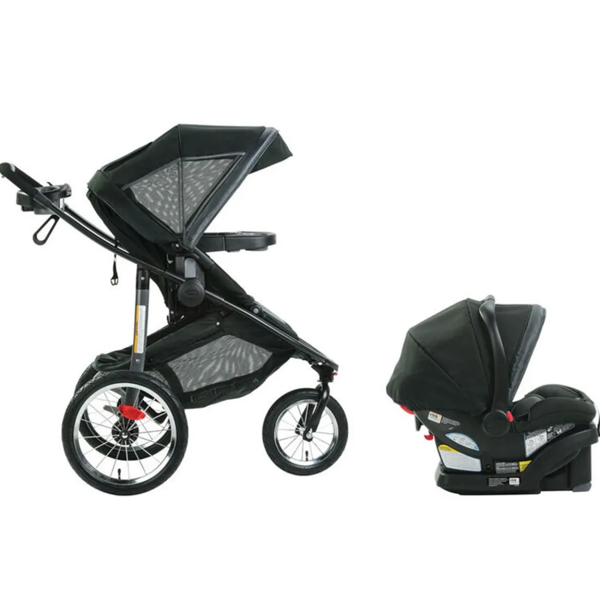 The Graco Modes Jogger 2.0 Travel System includes a jogging stroller and an infant car seat, giving you 7 ways to ride plus everything you need to jog, now with improved maneuverability for easy navigation. This jogging stroller has all the comfort and convenience features you need: air-filled rubber tires, a safety tether, a large UV 50 canopy, and ample storage. The one-hand, self-standing fold makes on-the-go adventures a breeze. Keep your child comfortable with the adjustable calf support, and keep them satisfied with the child’s tray with cup holders. The travel system includes the Graco SnugRide SnugLock 35 Infant Car Seat, which attaches to the stroller with a one-step, secure connection.