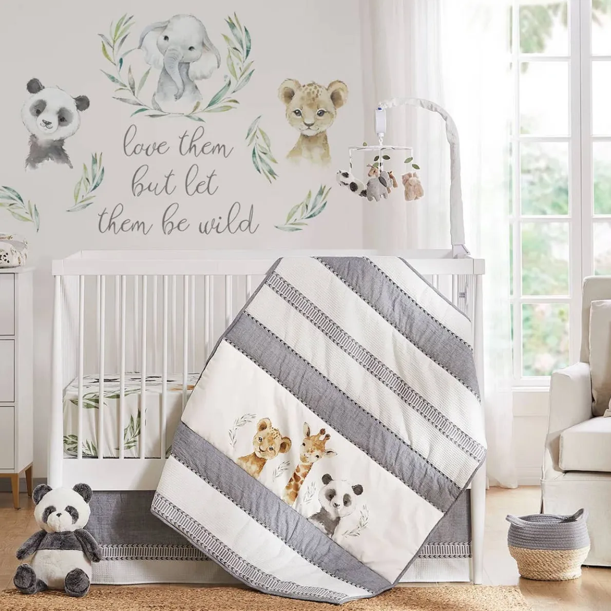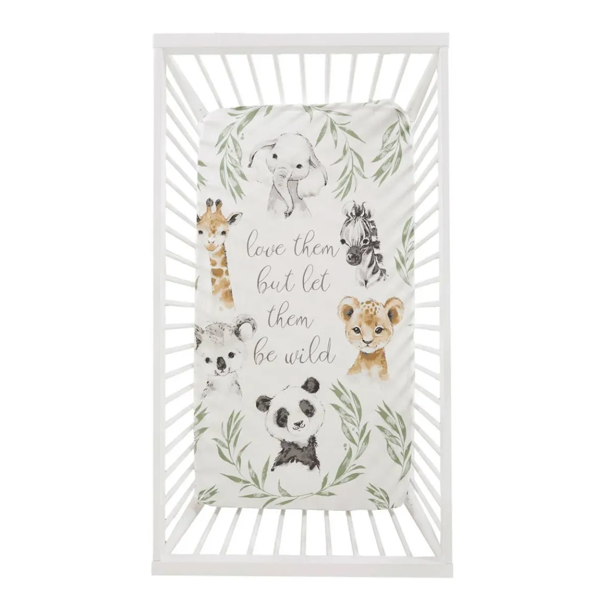Your baby will rest peacefully on the Levtex Baby Mozambique Fitted Crib Sheet. One fitted sheet has mini portraits of jungle babies all throughout on a cream ground and the other is simple green leaves on cream ground . These fitted sheets are gentle on your baby’s soft skin and features elastic edges so that it fits snuggly around a standard-size crib mattress, staying in place until you remove it for cleaning. These sheets will transform your nursery, adding accents. Enjoy for years to come!