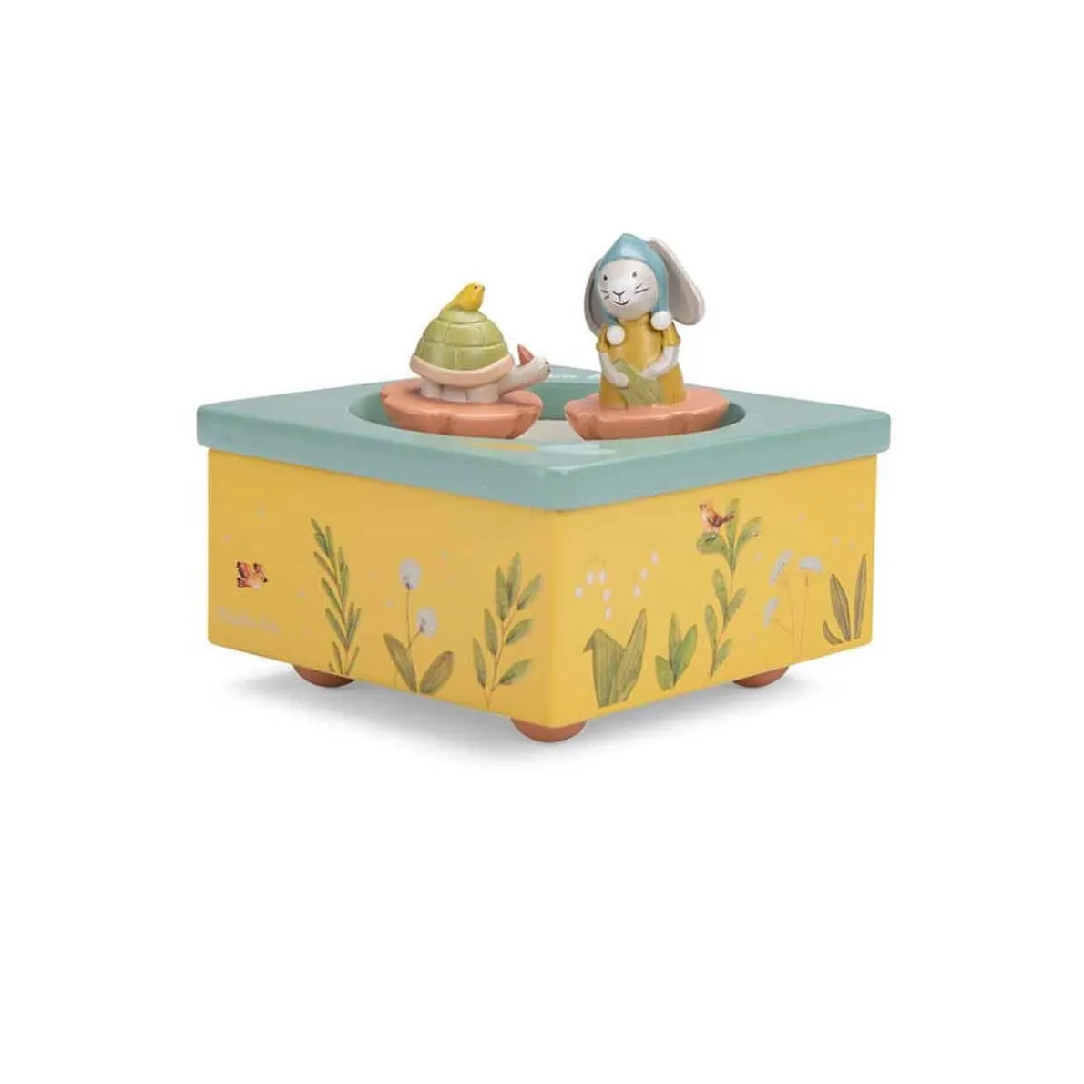 Musical box in the same colours as the range, illustrated with a cheerful scene featuring plants, vegetables and little garden birds. The rabbit and tortoise rotate and dance on the track to soothe baby into a deep sleep.