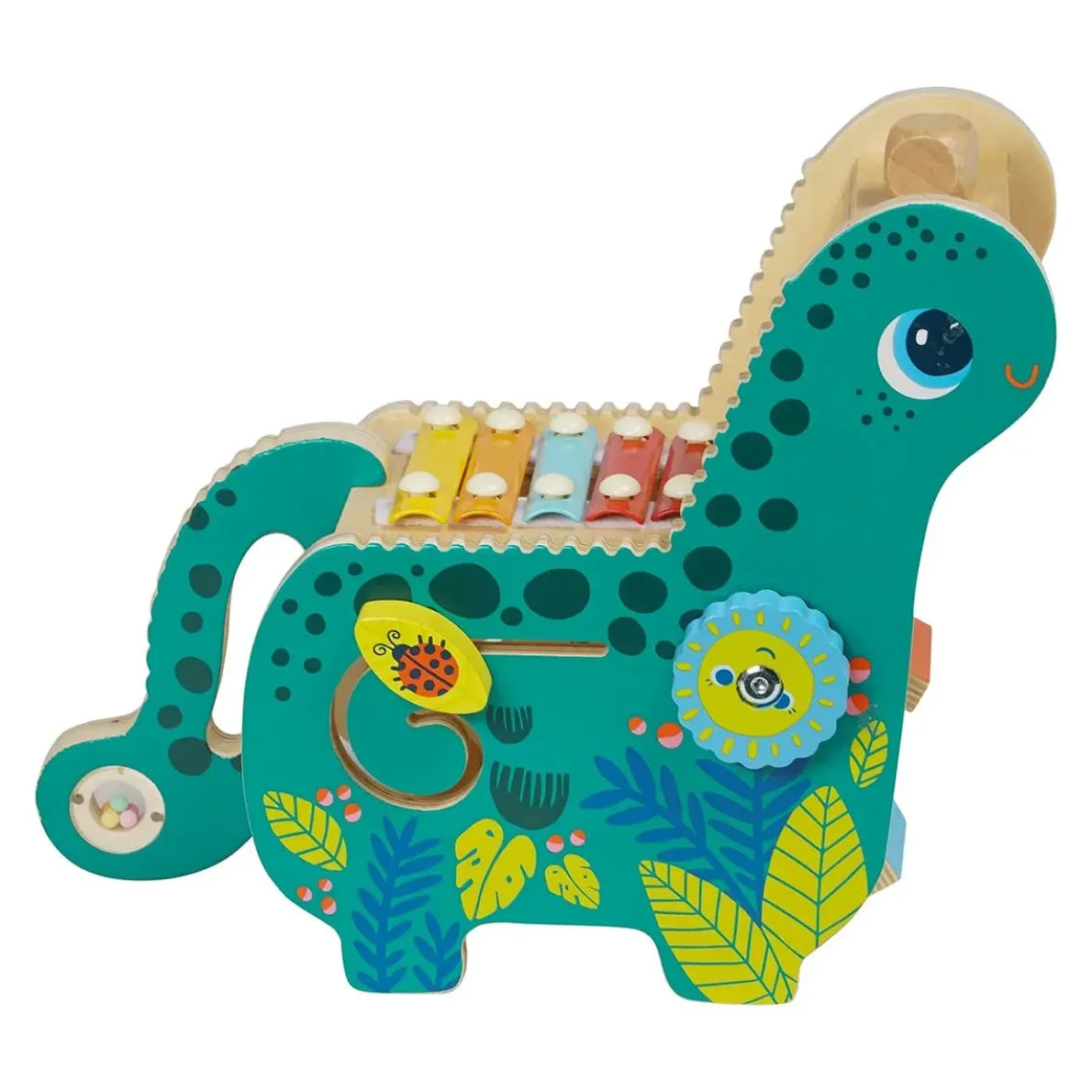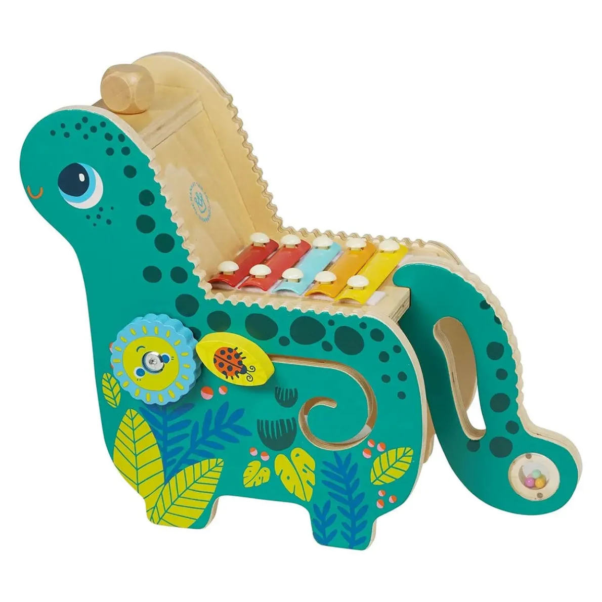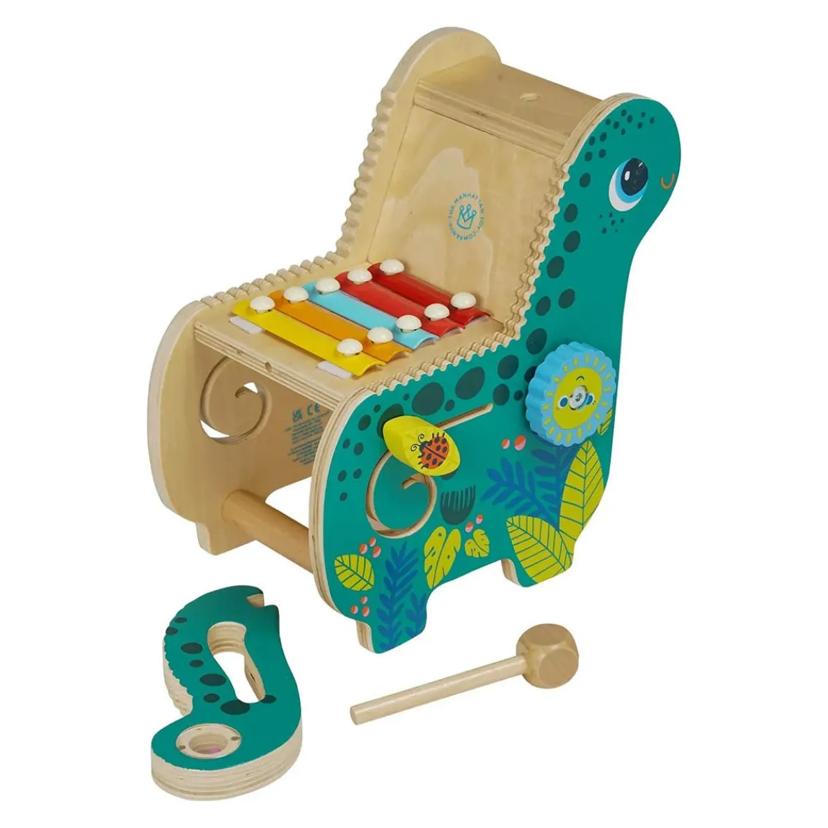 Musical Diego Dino wood toy is chock-full of sensory fun and noise-making activities. Features include 5-key metal xylophone, 2 spinning gears, 2wooden ladybugs that move along tracks, 1 detachable maraca tail, noise-making ridges on neck and back, and 4 double-sided rotating panels with numbers and objects. Diego comes with 1 wood mallet for playing the xylophone and scraping against the ridges along the top, back, and tail. Store the mallet atop the dino head when playtime is over. This artfully designed toy doubles as nursery room decor. Musical play encourages cause-and-effect learning while building motor skills and sensory development. Standing play is only recommended for children able to stand unassisted.