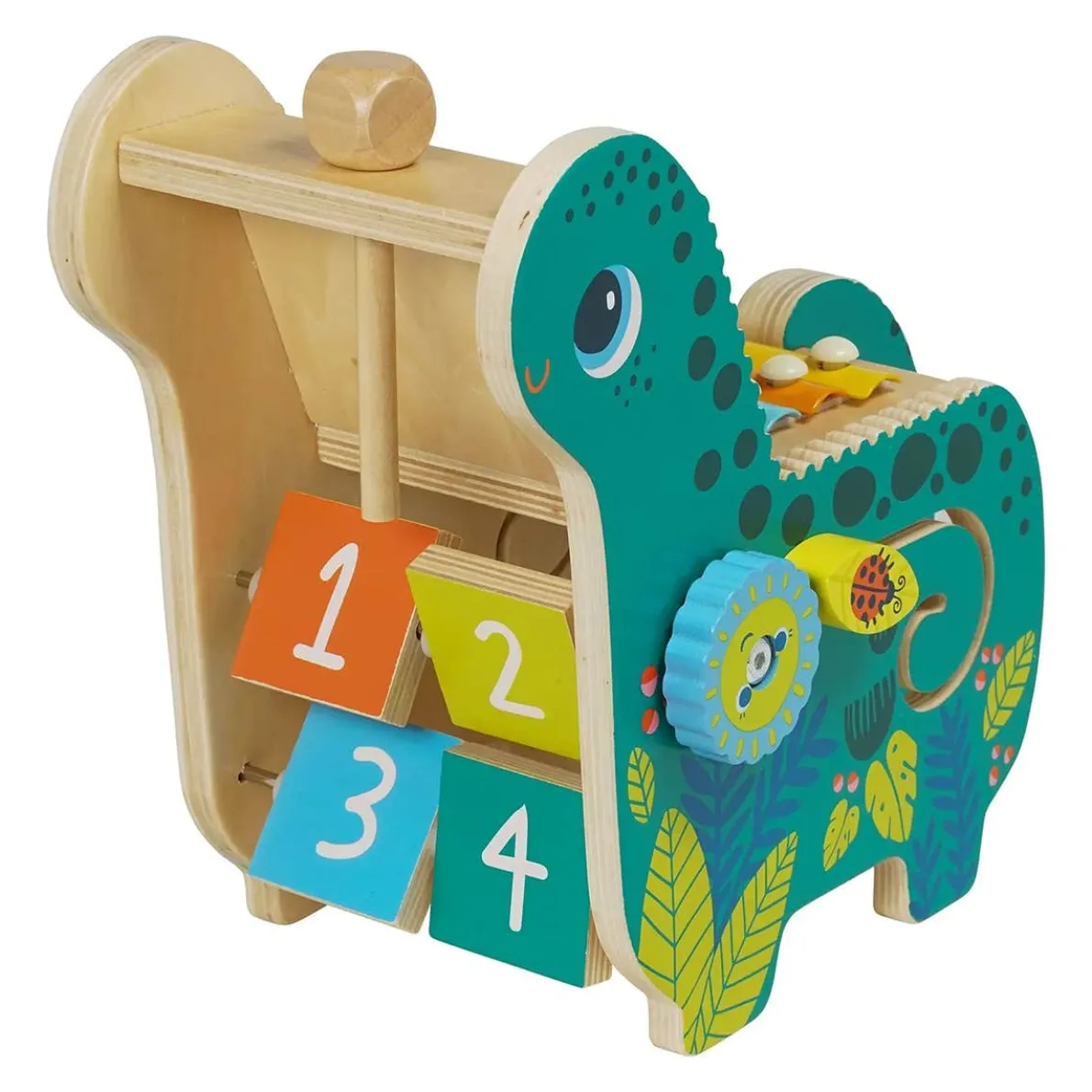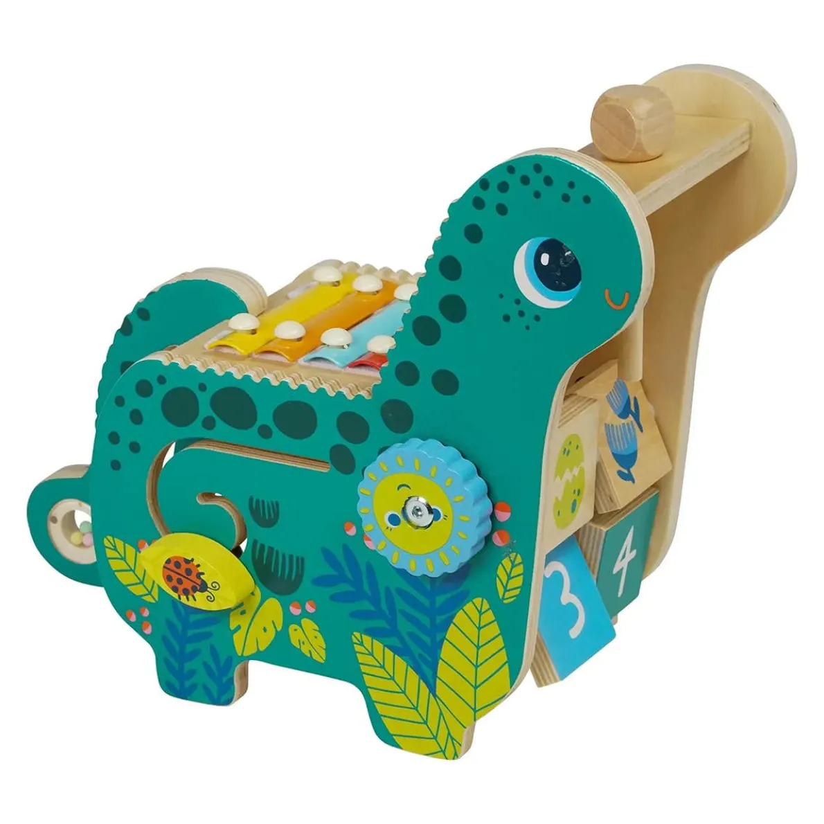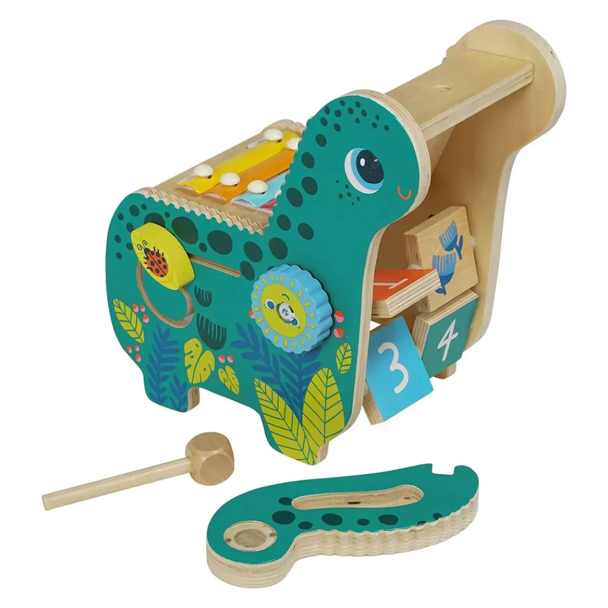 Musical Diego Dino wood toy is chock-full of sensory fun and noise-making activities. Features include 5-key metal xylophone, 2 spinning gears, 2wooden ladybugs that move along tracks, 1 detachable maraca tail, noise-making ridges on neck and back, and 4 double-sided rotating panels with numbers and objects. Diego comes with 1 wood mallet for playing the xylophone and scraping against the ridges along the top, back, and tail. Store the mallet atop the dino head when playtime is over. This artfully designed toy doubles as nursery room decor. Musical play encourages cause-and-effect learning while building motor skills and sensory development. Standing play is only recommended for children able to stand unassisted.