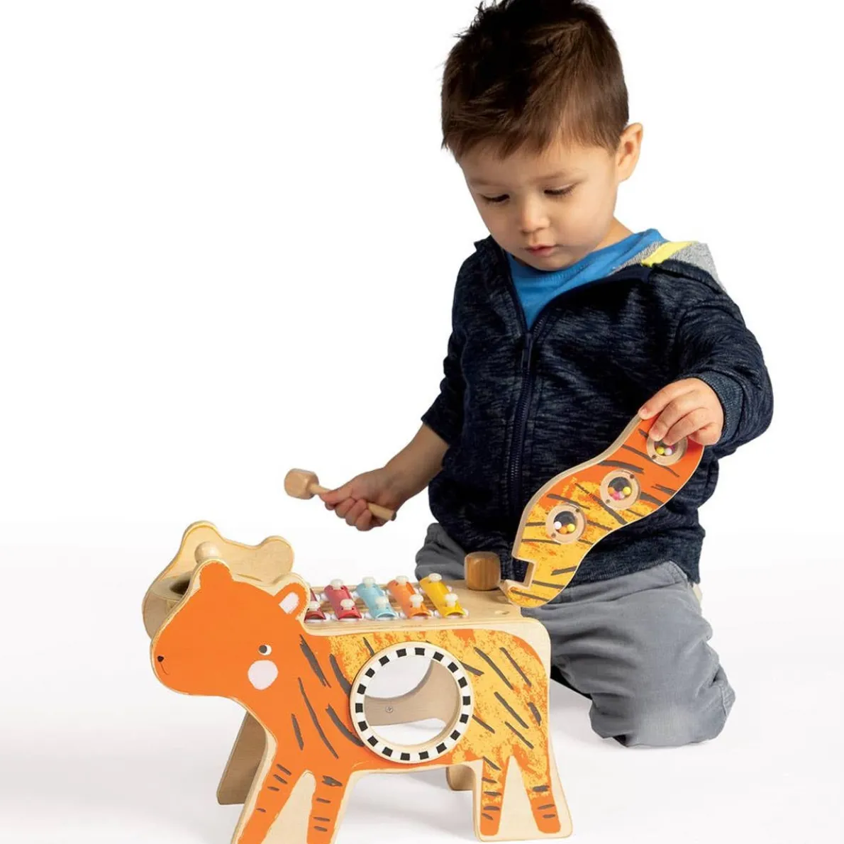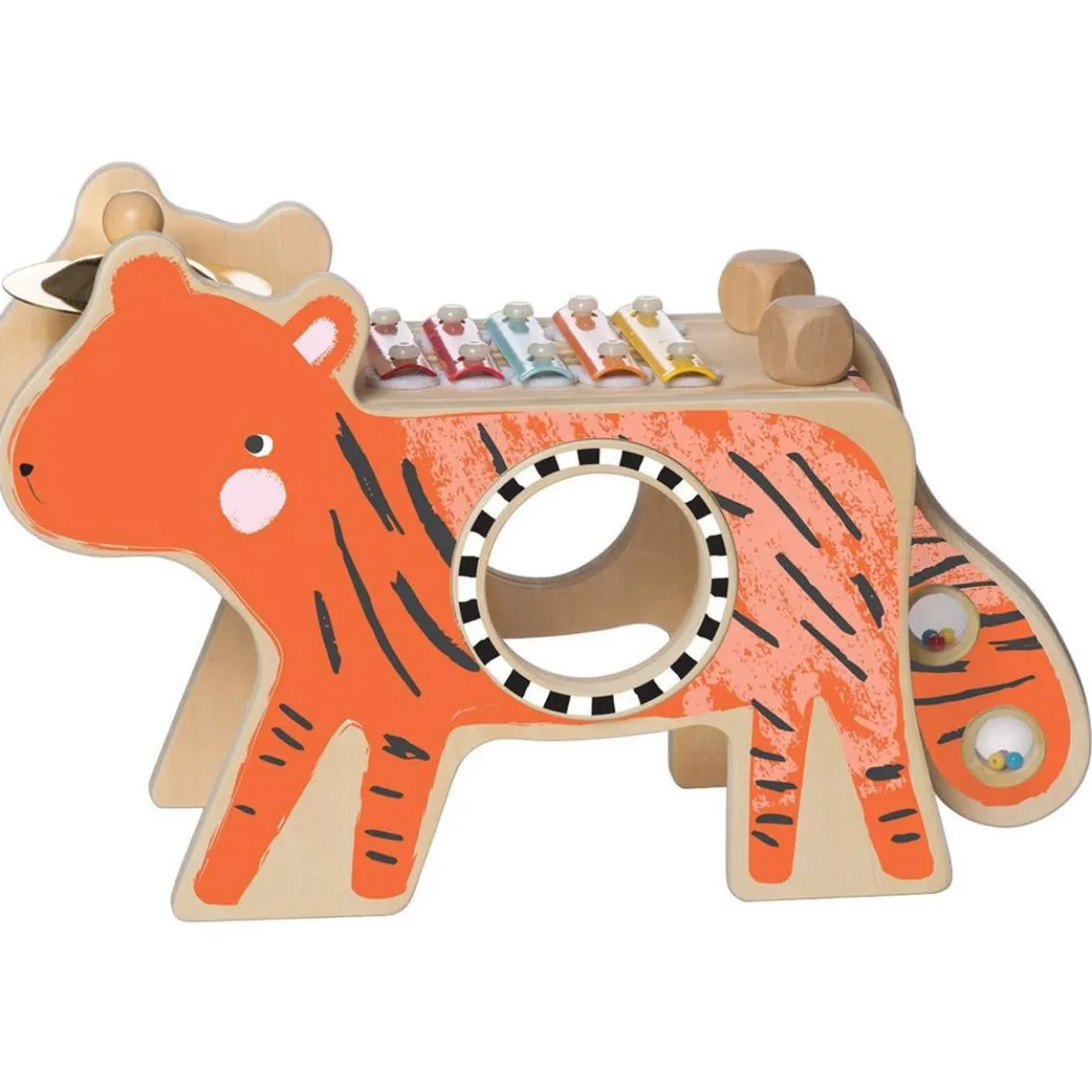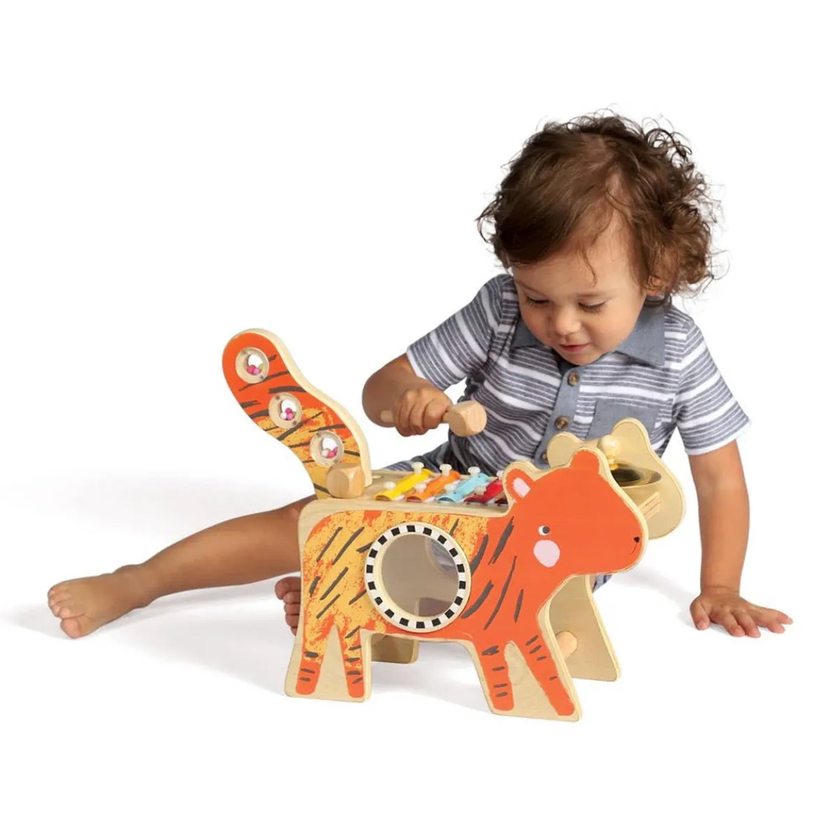 The Musical Tiger comes with: 1 cymbal, 5-bar xylophone, 1 maraca tail, 2 side drums and detachable drum sticks on the back. The tail of this curious cat can be removed and doubles as a maraca.