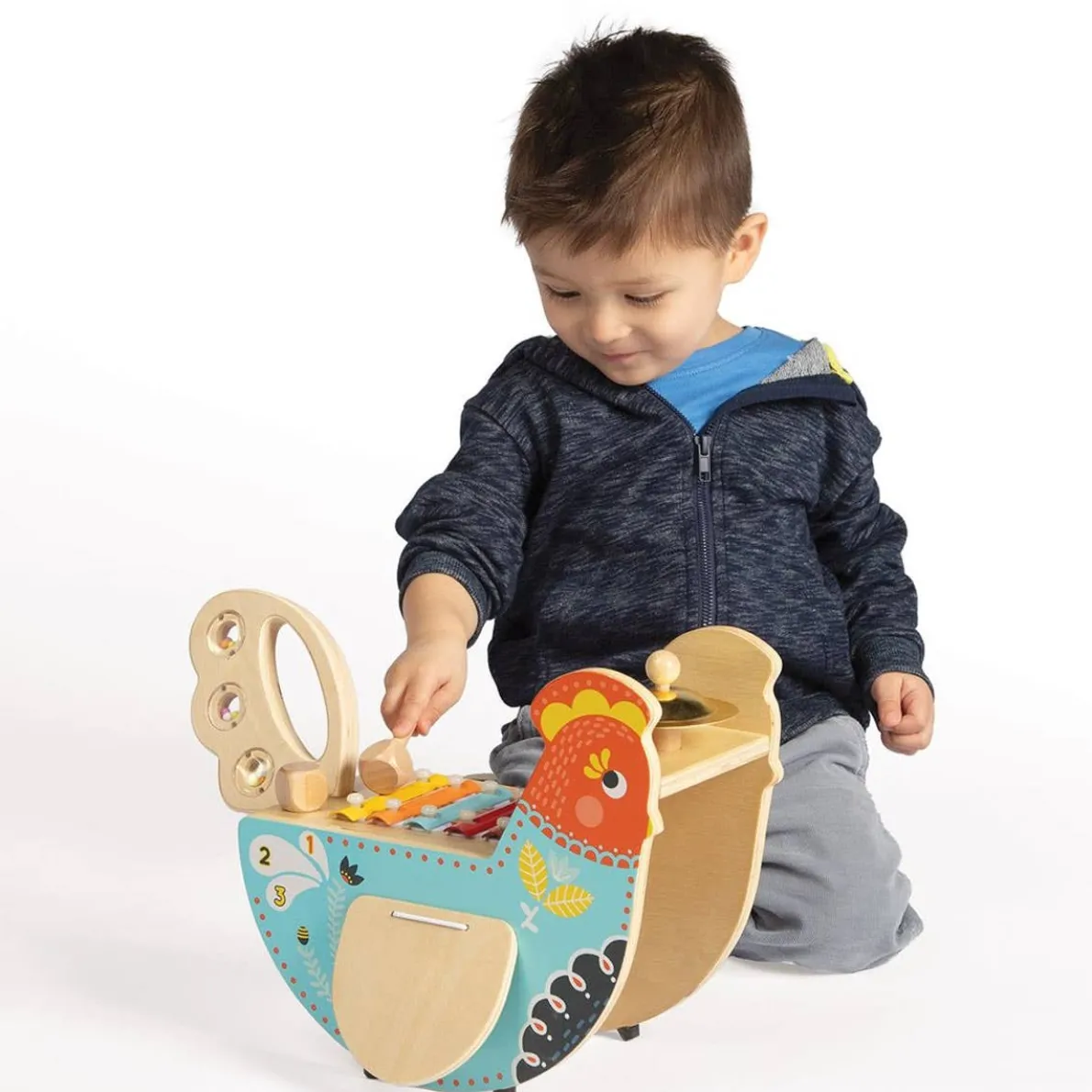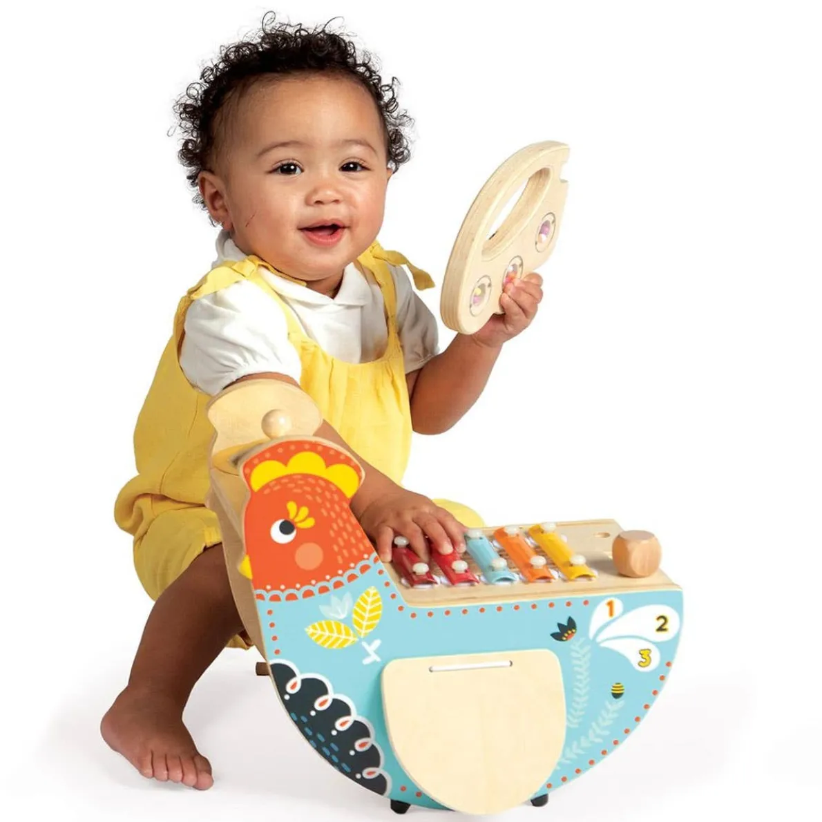 The Musical Chicken comes with: 1 cymbal, 5-bar xylophone, 1 maraca tail, 2 clacking wings that double as drums with mallets that store back by the tail.