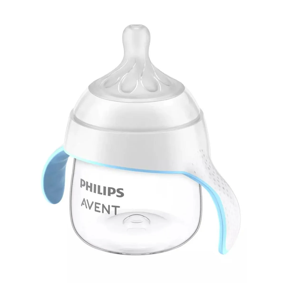 This Philips Avent My Natural Trainer cup makes it easier for your child to transition from bottles to sippy cups. Ideal for babies 4 months and up, this cup comes with both soft, a Natural Response nipple as well as a soft spout, allowing flexibility to move from bottle to cup whenever your child is ready to make the transition. The design encourages your child to gradually get used to drinking from a sippy cup while providing the familiarity of a bottle nipple and then the comfort of a soft spout. The soft, flexible nipple only releases milk when baby is actively drinking.