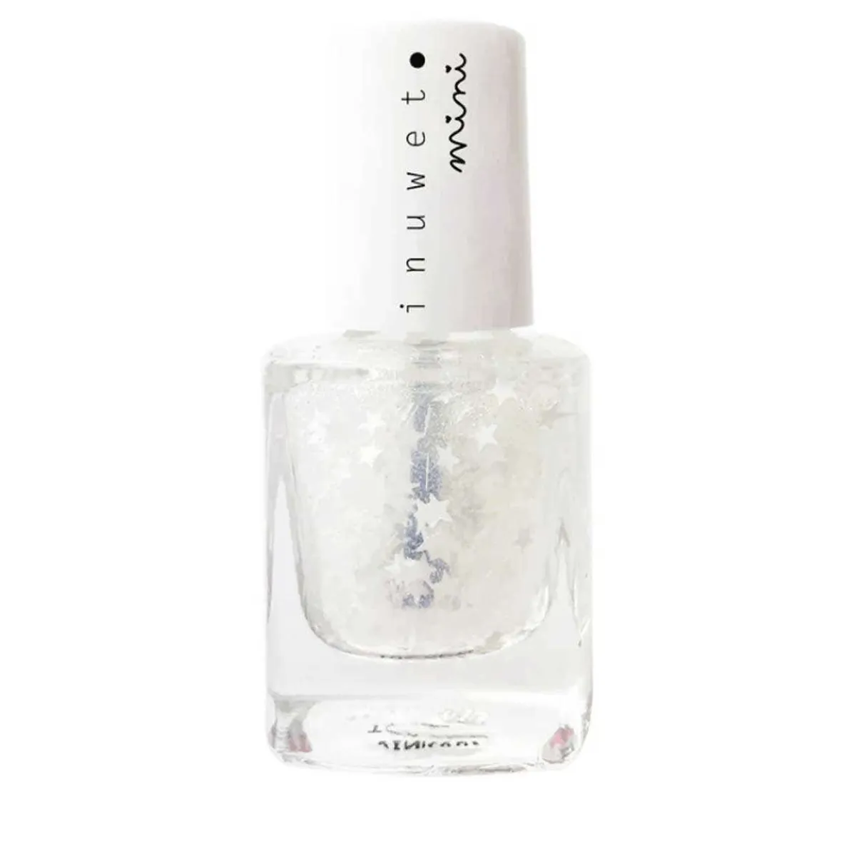 To dream with your eyes open. Nail polish for little ones to emulate the grown-ups, yet easily removable with water! Its aqueous base, solvent-free, is natural and biosourced—100% vegan and Made in France. Free from any controversial ingredients to respect the minis. A transparent top coat adorned with white stars, fragrance-free.