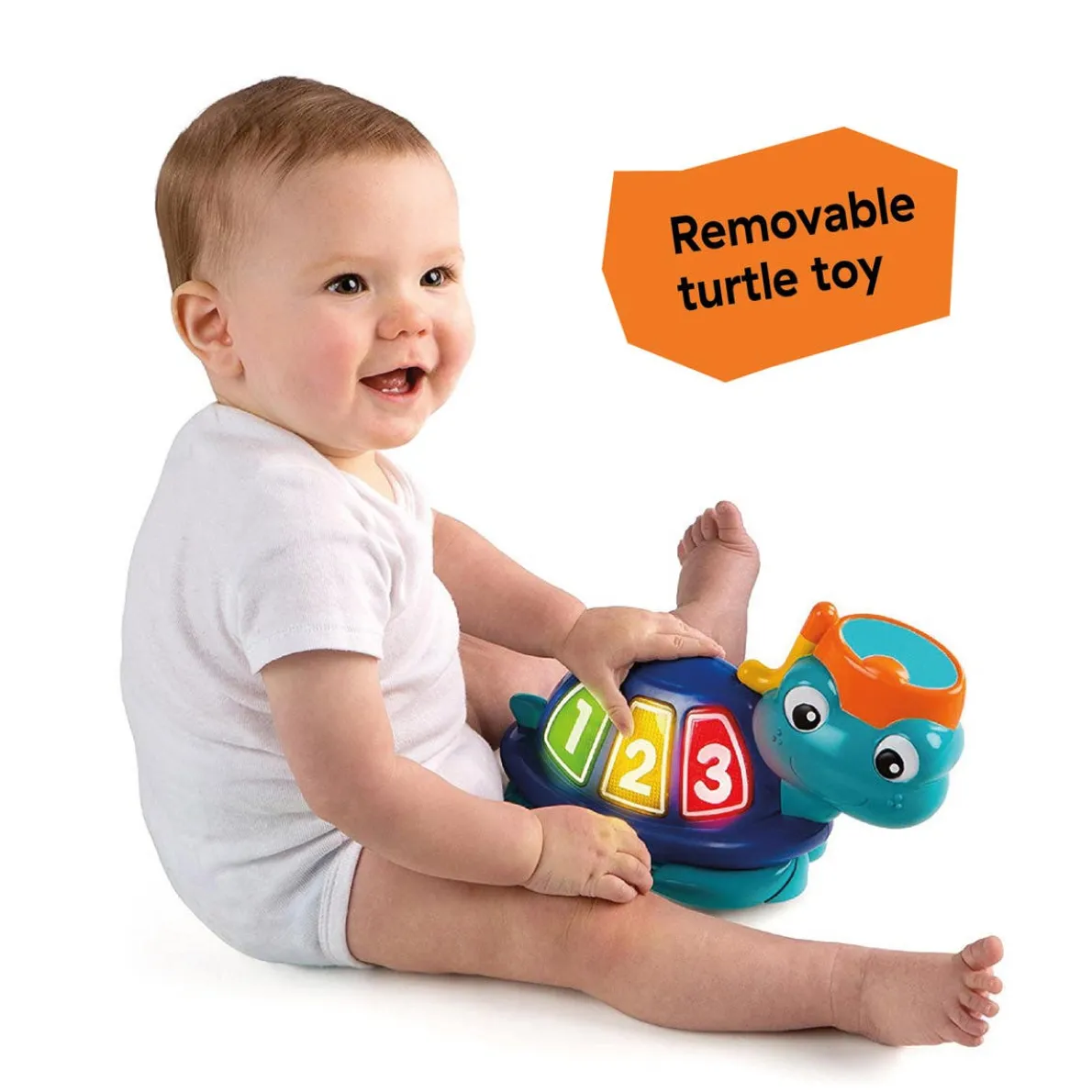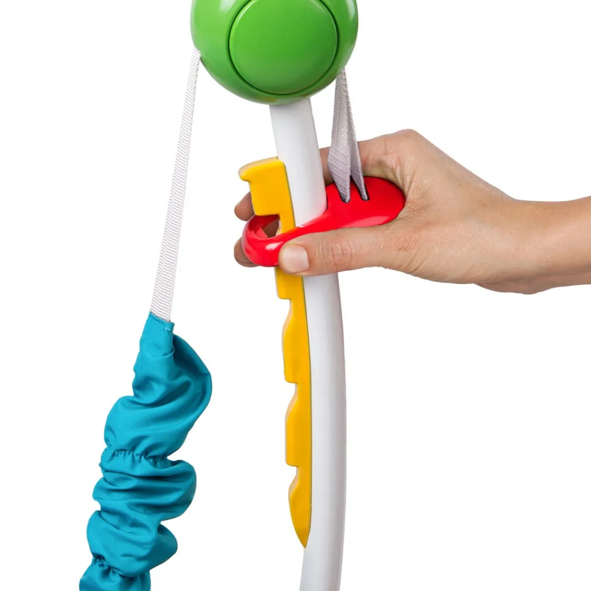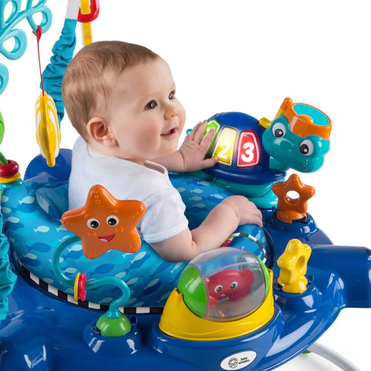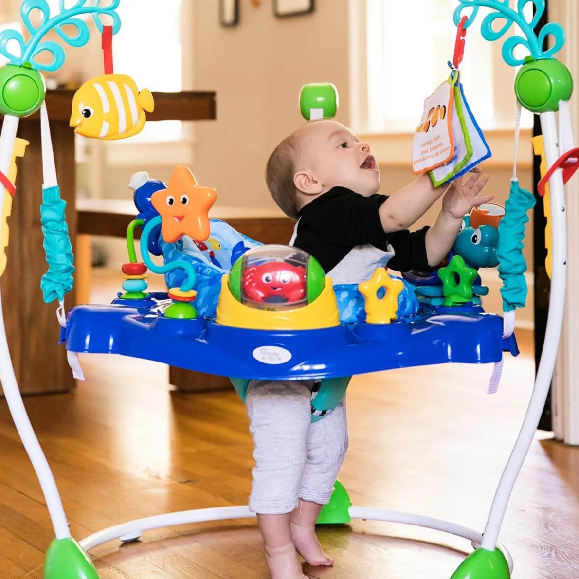 The Baby Einstein Neptune’s Ocean Discovery Jumper gives your baby 360 degrees of engaging activities with a splash of underwater wonder. Your mini-marine explorer can embark on a playtime expedition and swivel from toy to toy in the height-adjustable baby bouncer. There’s a crab that spins inside a clear ball, a little starfish that holds a self-discovery mirror, an octopus paddle toy, and flash cards with real underwater imagery to boost vocabulary. The removable sea turtle activity center helps your baby discover numbers and colors in 3 languages (English, Spanish, and French). With extra link loops, you can also add your baby’s favorite toys or swap out fresh ones for a new ocean of discovery. The baby bounce chair allows your little one to jump and dance, which helps strengthen their developing leg muscles. With no doorways required, you can watch your baby safely play and grow wherever you need to be.
