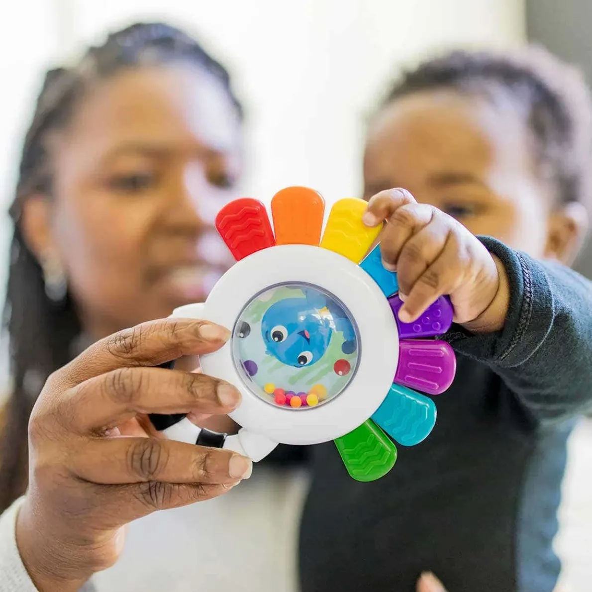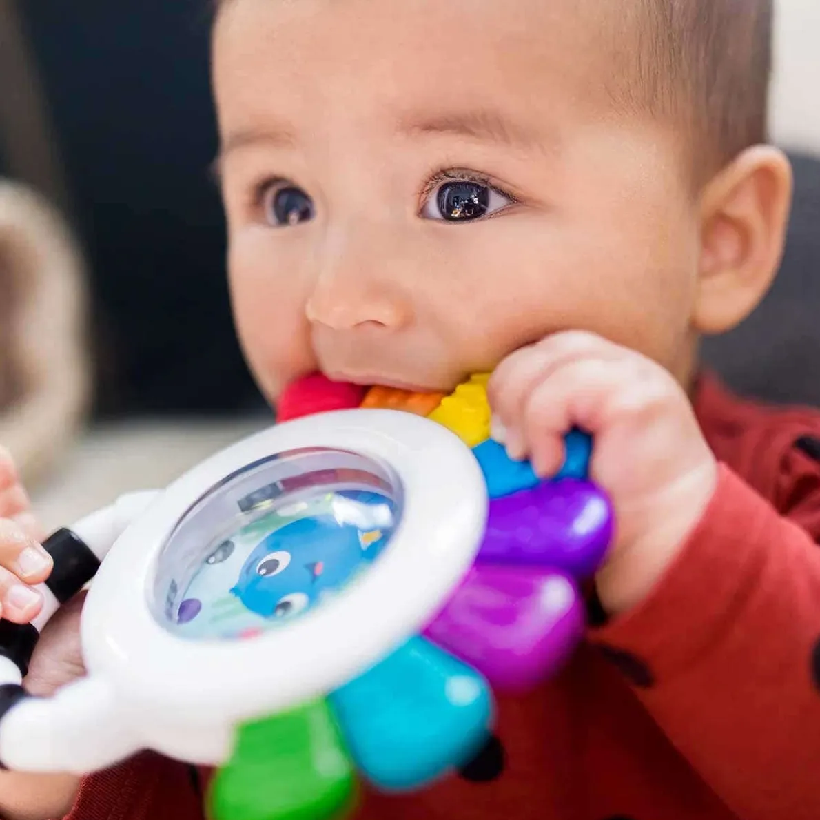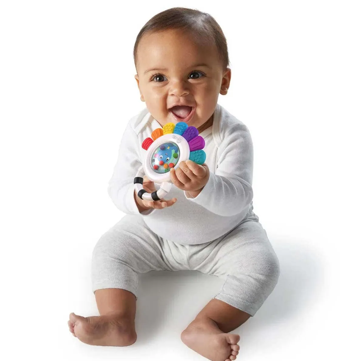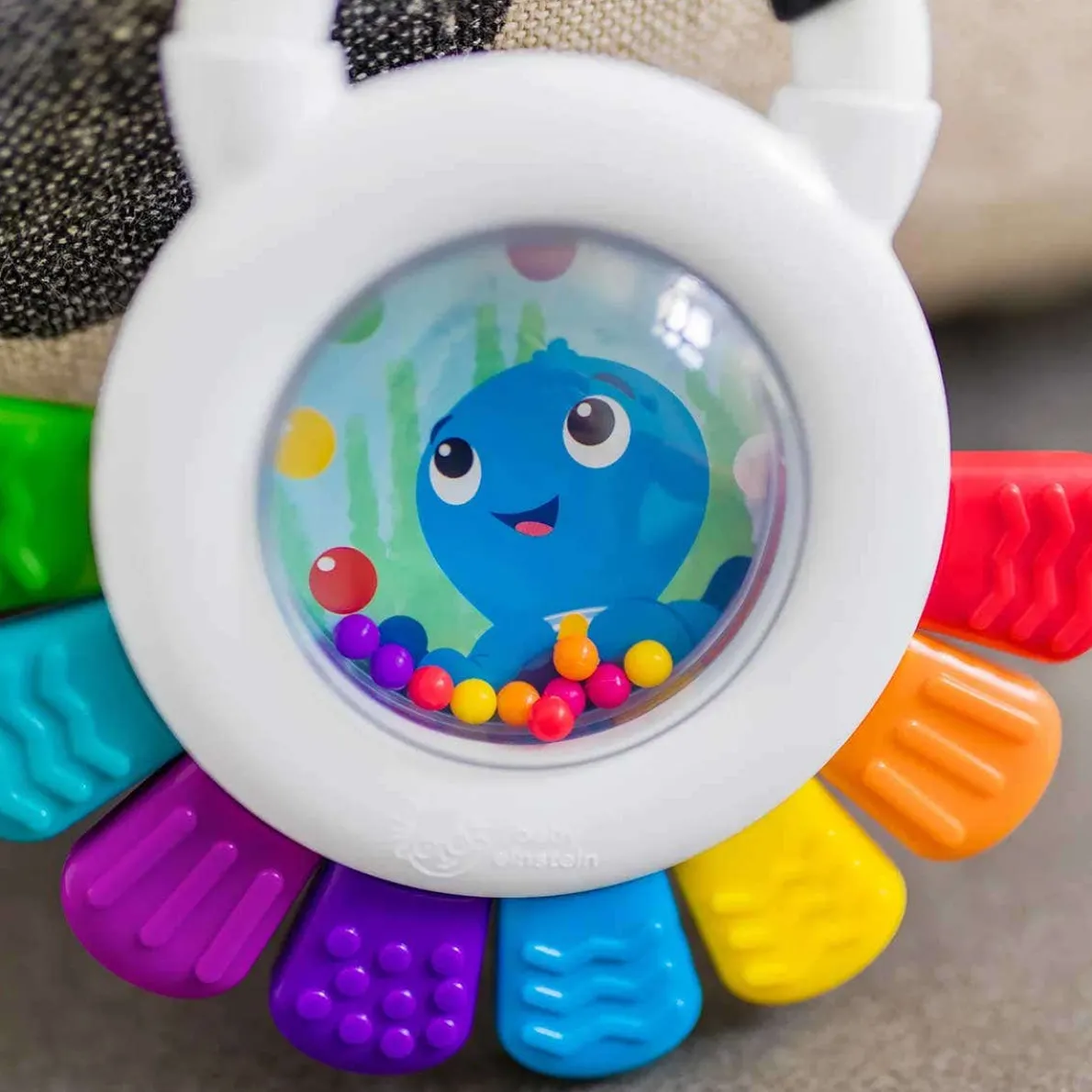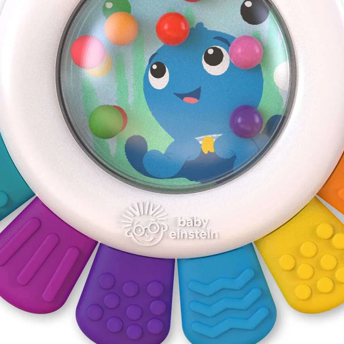 Meet Outstanding Opus™—the multi-sensory teether toy and rattle from Baby Einstein™ that features a bubble-pop with rattle beads, bright and high-contrast colors, and 8 teethable textures for baby to explore! This teething ring keeps baby engaged and curious while they get teething relief from the rainbow-colored textures.