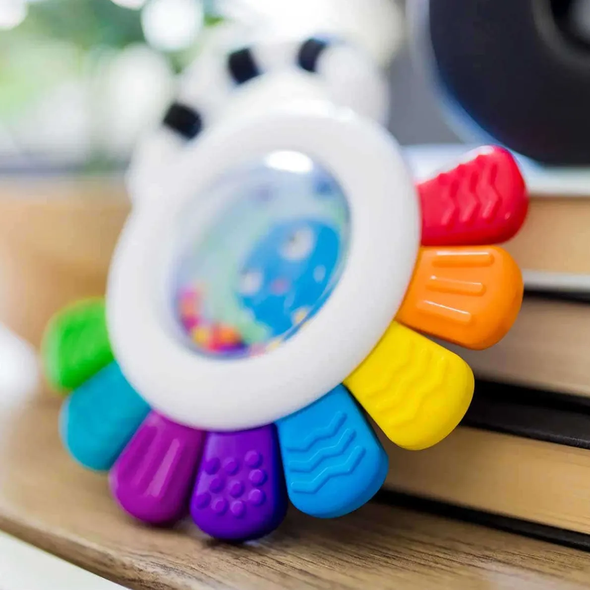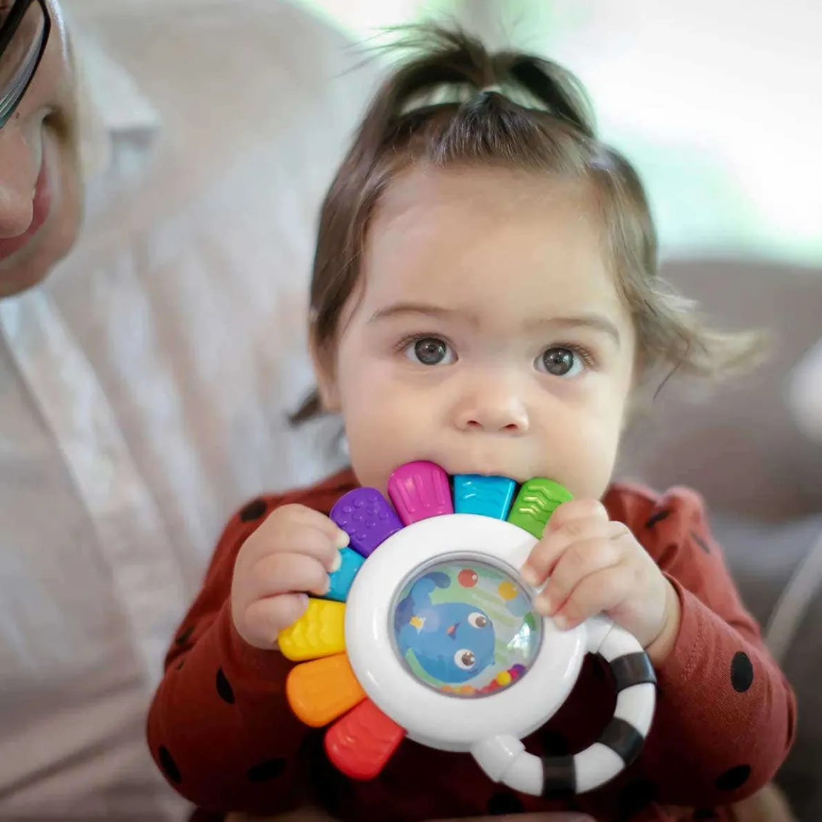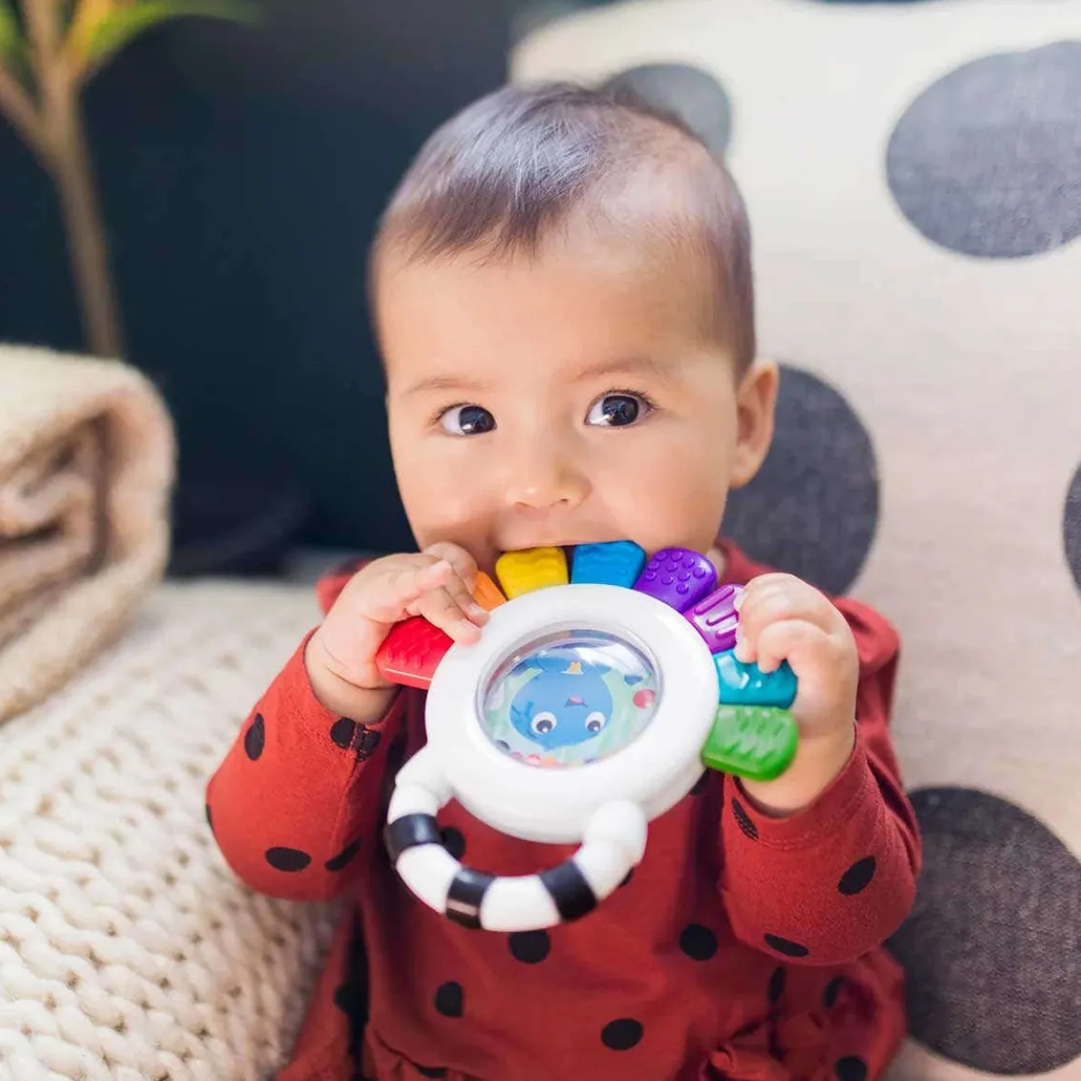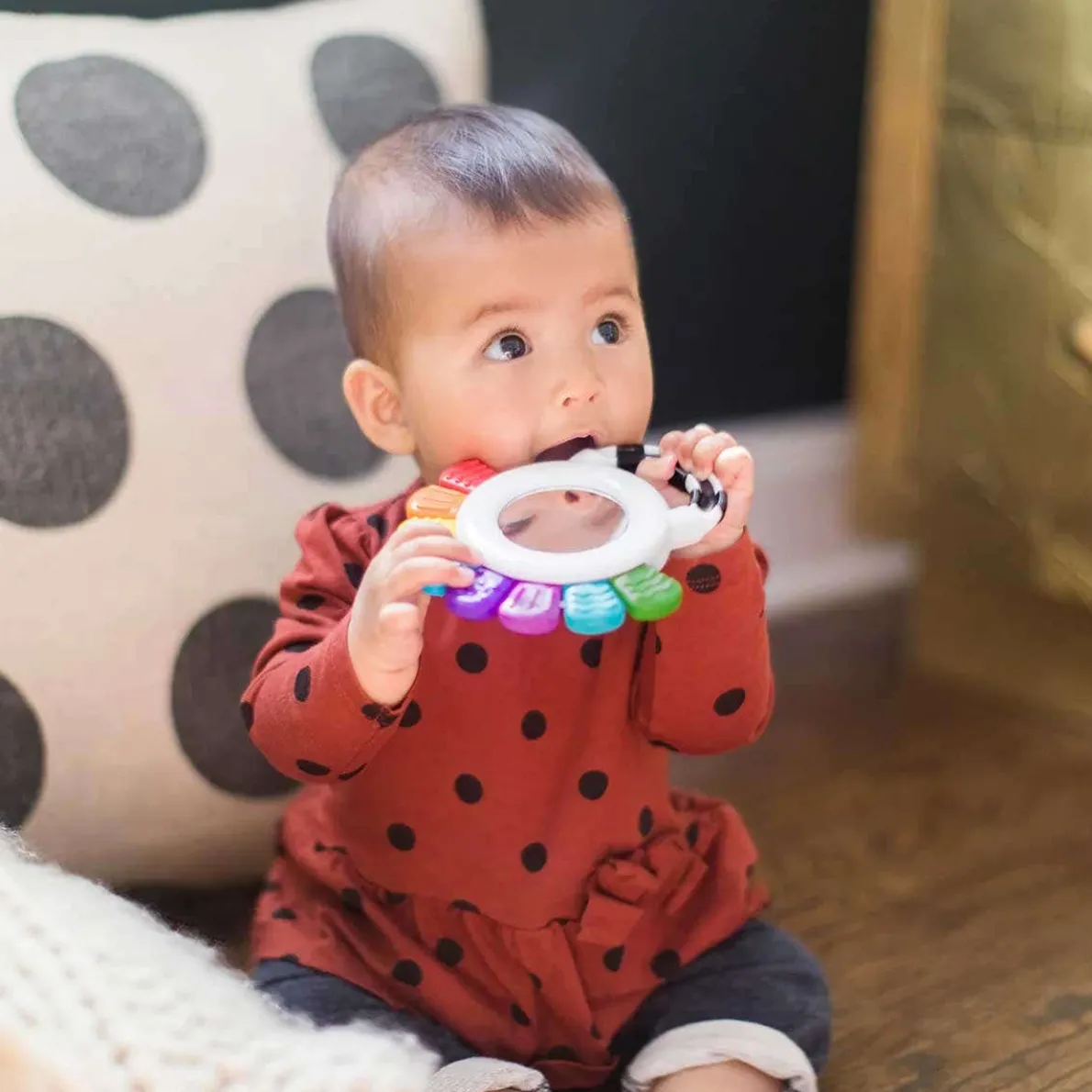 - Multi-sensory teether – Promotes sight, sound, and touch engagement with brightly colored rattle beds, and 8 touchable and teethable textures