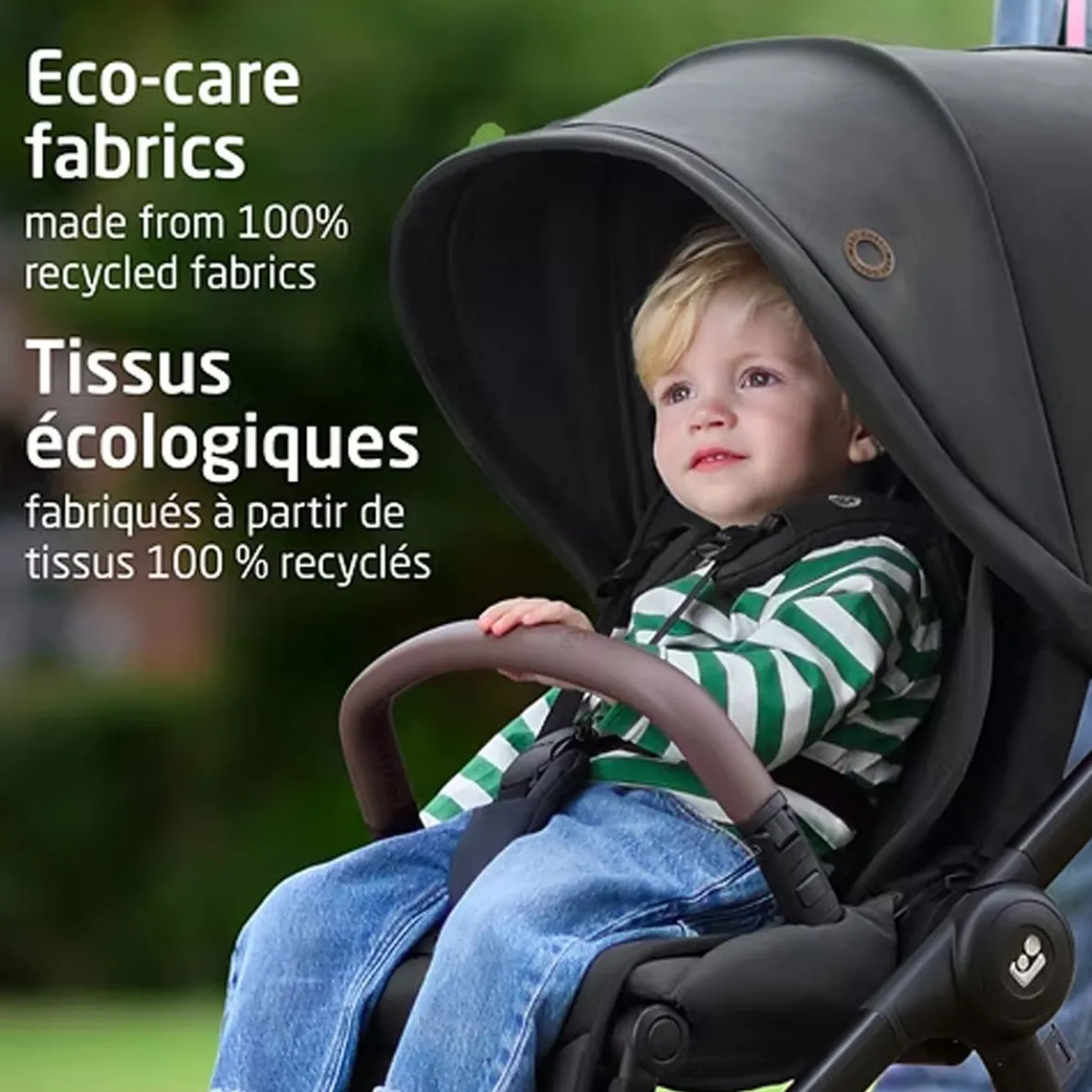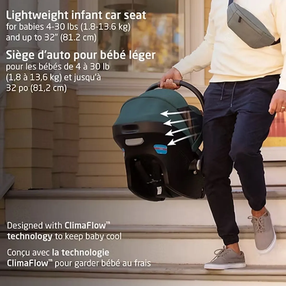 Your baby’s safety and comfort come first. The ClimaFlow™ technology shell provides added ventilation to keep your baby cooler. Side impact protection and plush padding on the removable infant head and lumbar inserts ensures a secure fit and cozy ride. Plus, energy absorbing EPP environmentally-friendly foam in the headrest area to effectively manage impact energy. The extendable ventilated canopy provides maximum shade and airflow. Enjoy added style and comfort with the vegan leather-trimmed ergonomic carrying handle contoured to curve around your hip.
