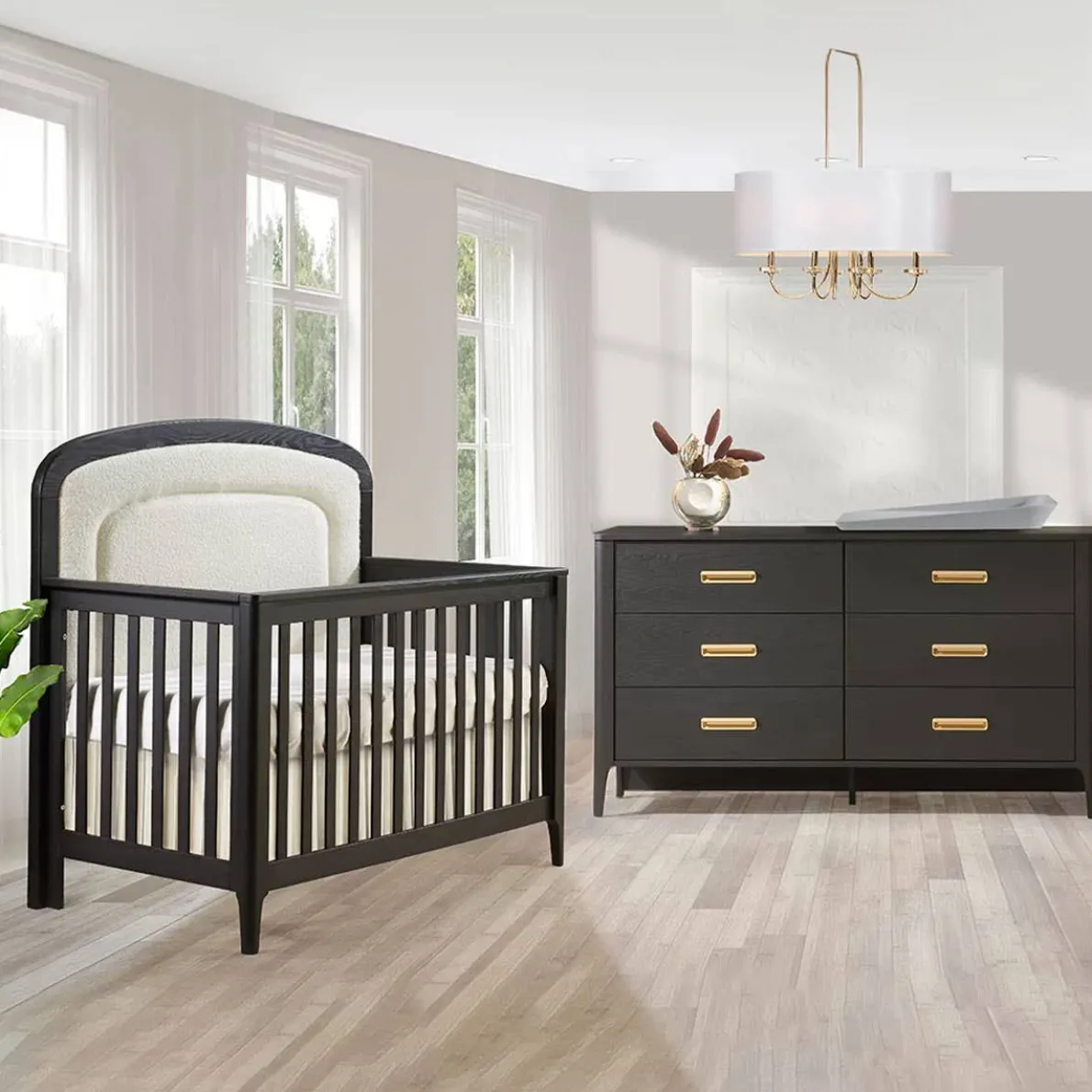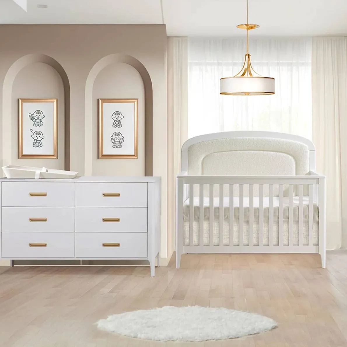 The Palo collection revisits the Mid-century style. The Convertible crib is designed with a uniquely curved headboard with upholstered Bouclé panel and rounded posts. The larger dresser & chest with rounded tops and posts are equipped with luxurious semi encased rounded handles from Italy.