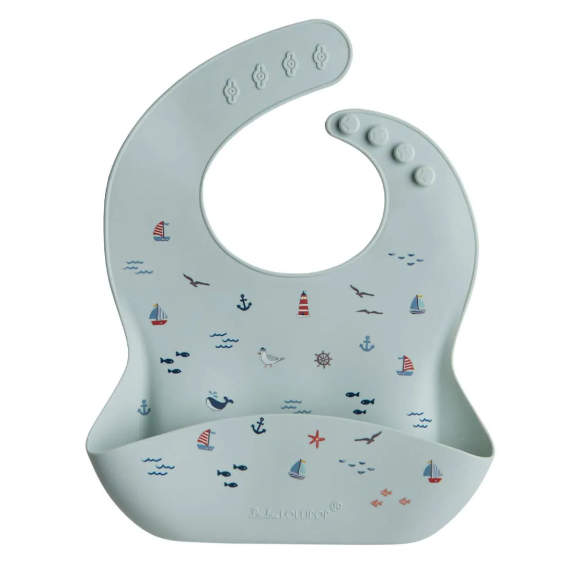 Loulou Lollipop silicone bibs are buttery soft, waterproof, and stain-resistant. It is easy to clean; simply wipe down for a quick cleaning or put it in the top rack dishwasher for a deep clean. It features a wide catch-all pouch that sits below a high chair tray – perfect for collecting food, crumbs, and spills. Reinforced buttonholes for a durable and adjustable fit for long-lasting wear, suitable for ages 3 – 36 months. This handy bib is available in various modern colors and fresh designs to make mealtime fun and enjoyable.