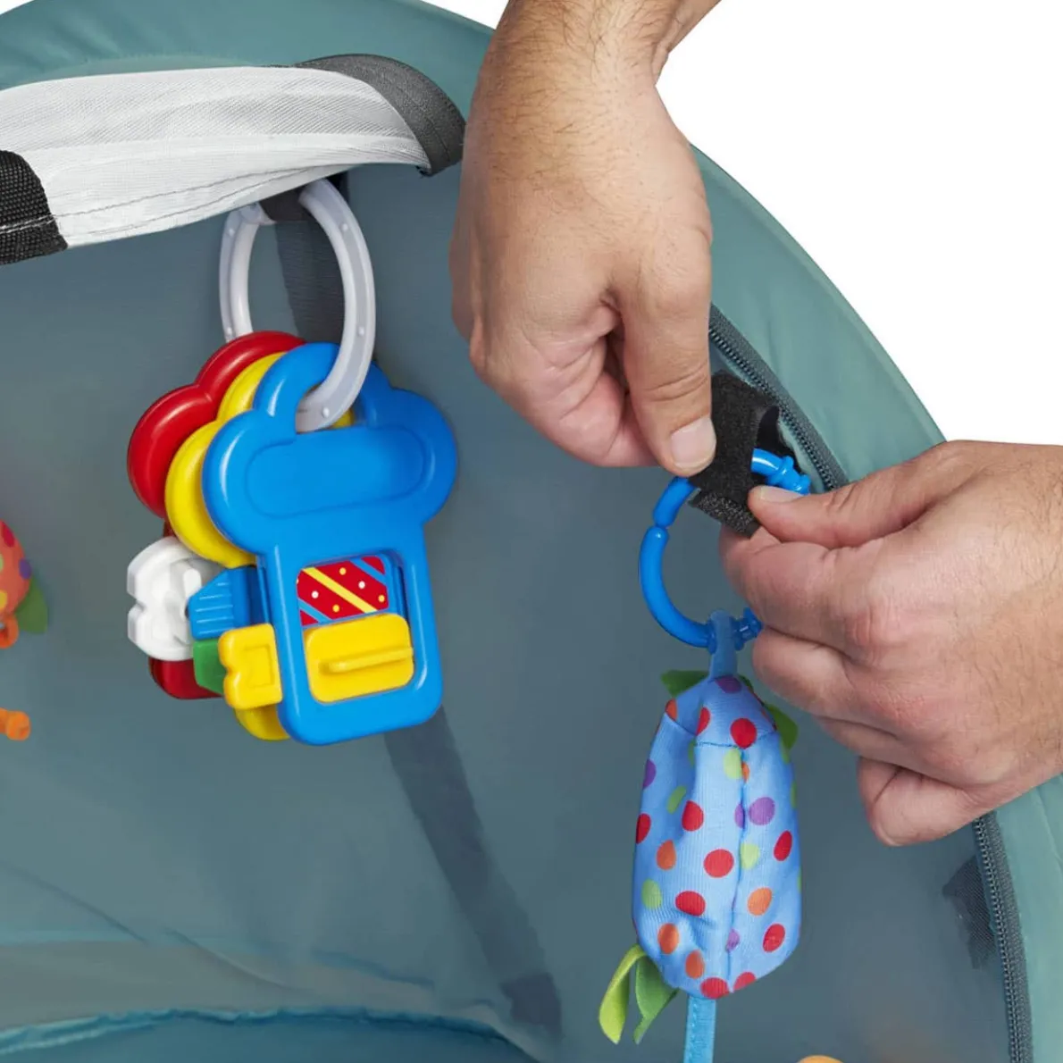- Sewn in Toy loops to create an instant activity center with child’s favorite toys