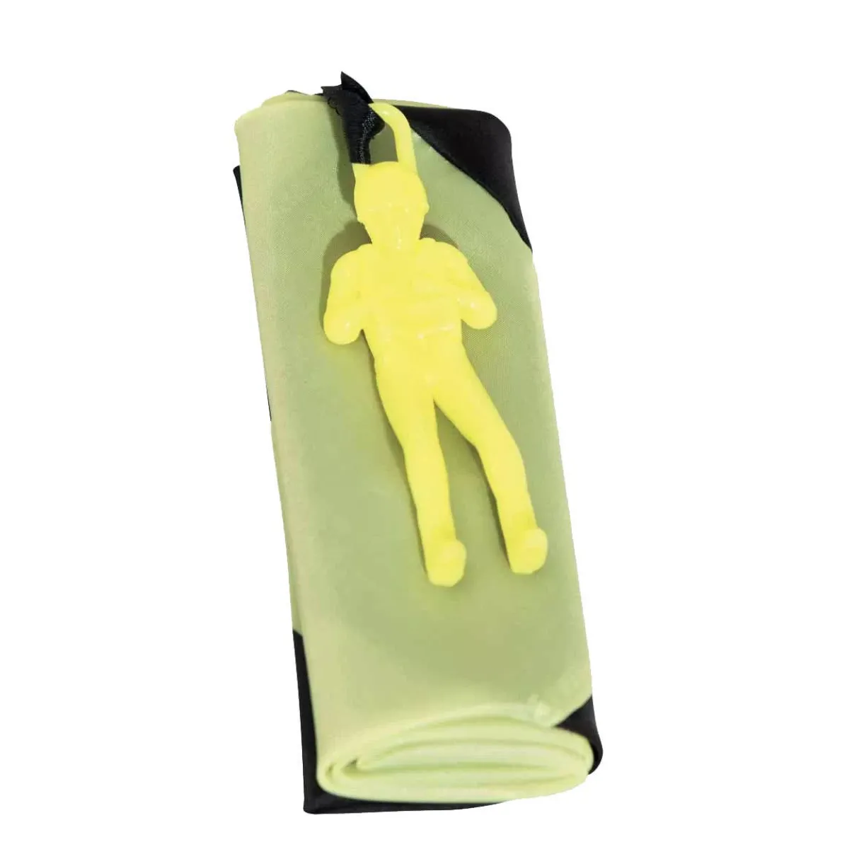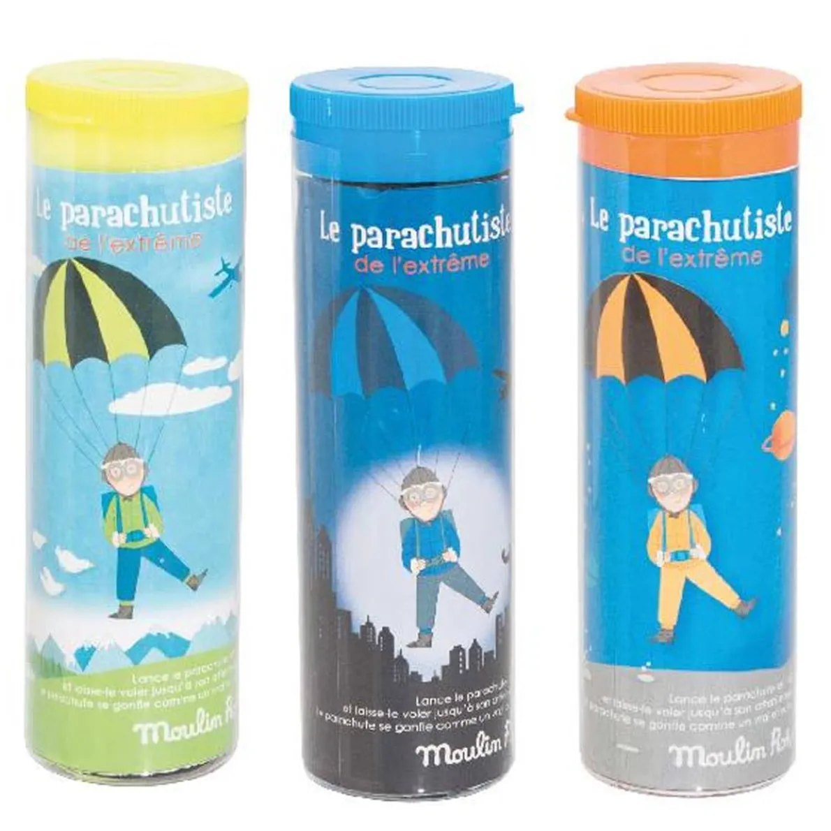 The parachute fills with air and floats gently down to the ground. Each parachutist matches his own parachute, each with their own colour and their own world!