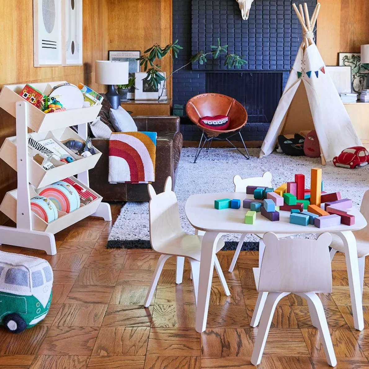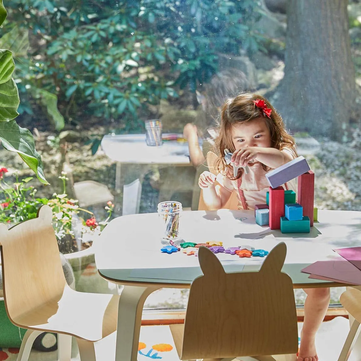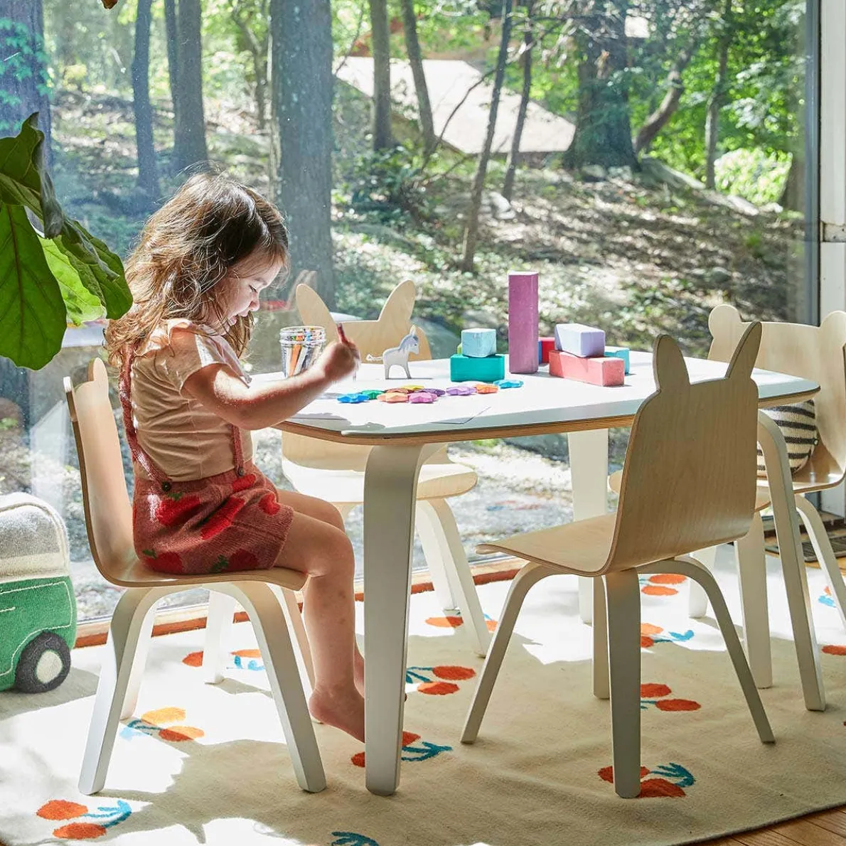 Art projects, tea parties, and snack time are all more fun in kid-sized proportions. Stylishly simple yet wonderfully inventive, this play table set makes a lovely addition to a nursery or play room, and features durable, eco-friendly finishes with an easy-to-clean laminate tabletop.