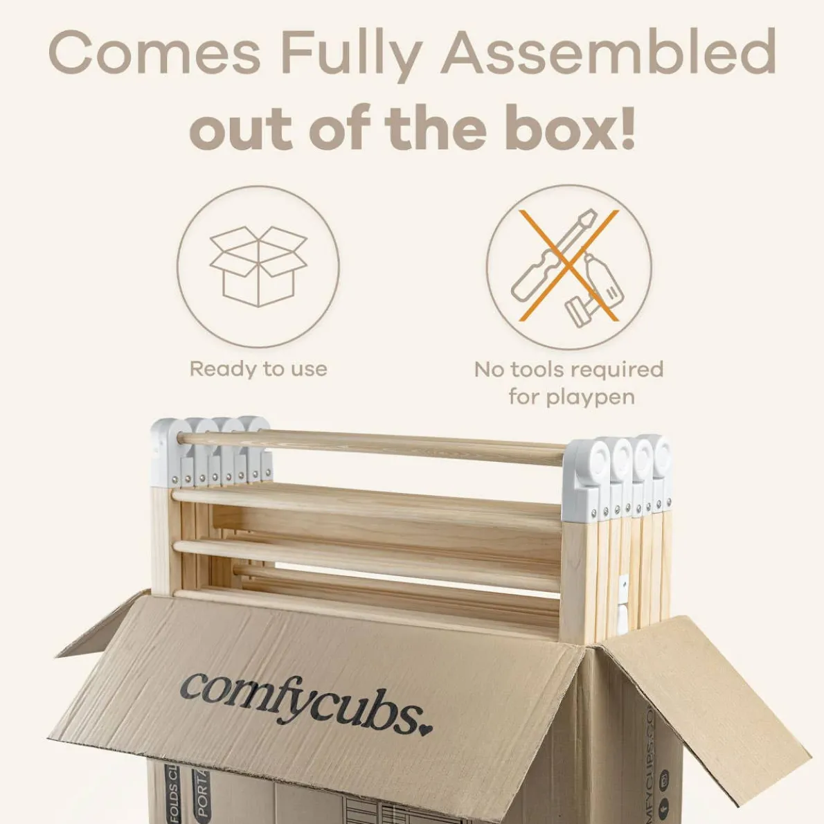 - Natural and Safe Materials: Play pen is made from natural pine wood with a smooth touch. Comfycubs prioritized your child’s safety, using no varnishes or chemicals, ensuring an environment free of toxins and harmful substances.