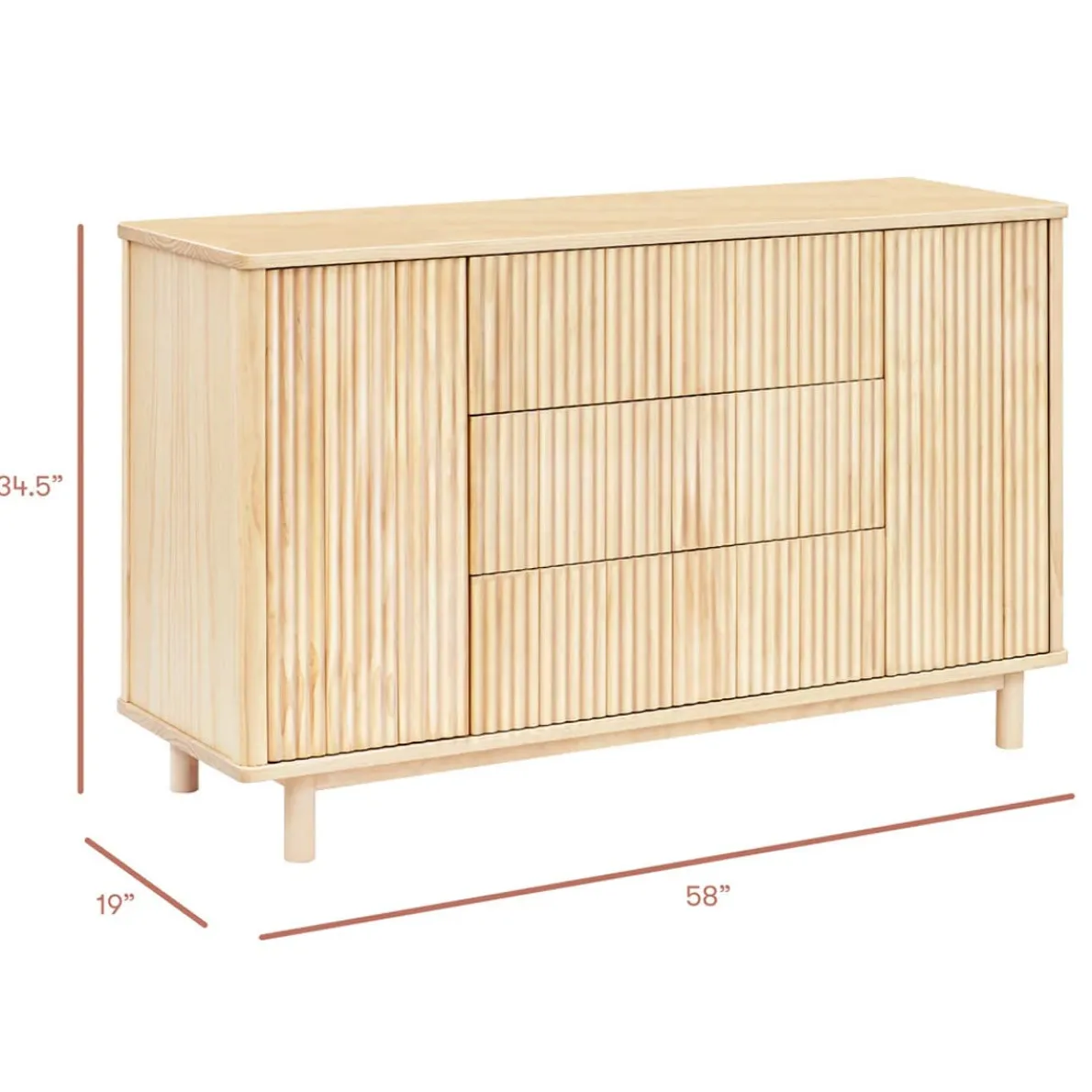 The timeless Pogo Tambour Dresser by Babyletto exudes modern elegance with its textured fluted tambour paneling, smooth, rounded edges, and elevated silhouette. Designed for the nursery but beautiful enough for use throughout the home, it features push to open smooth-gliding drawers, spacious side cabinets, included anti-tip kit for safety, and best-of-all, the Pogo Tambour Dresser by Babyletto arrives fully assembled, ready out of the box.