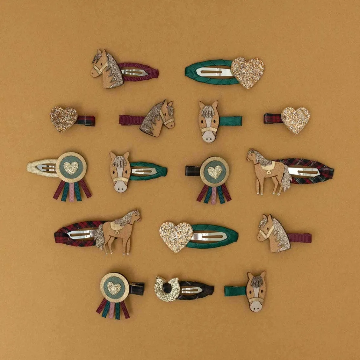 - Ponies, rosette, heart and horseshoe crafted from a mix of suedette, glitter and metallic fabrics with grosgrain ribbon tails