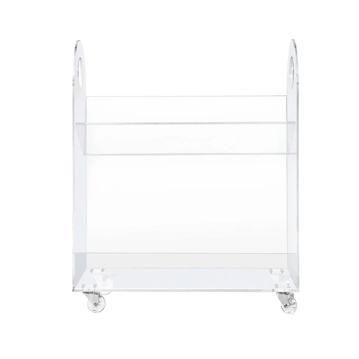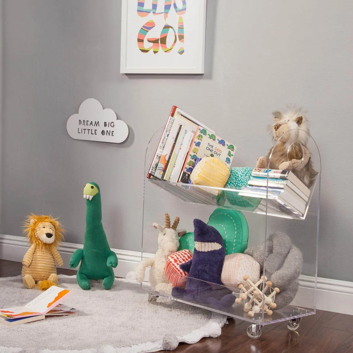 Open tiered library storage has never been more stylish or portable with the Presto Acrylic Bookcase and Cart. Roll those books and plush buddies wherever you and your lil’ bookworm go, knowing they can view and pick out just what is needed for story time or play, pronto!