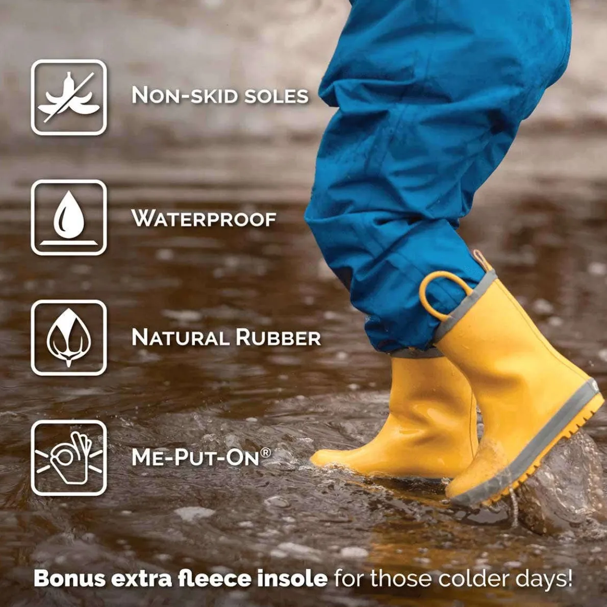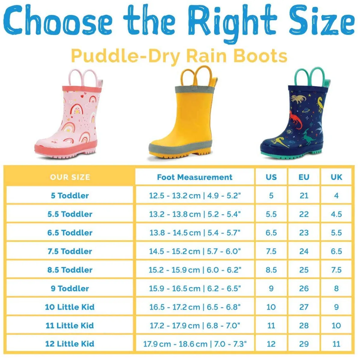 These rain boots are versatile for all season wear! Lined with 100% breathable cotton and comes with two sets of insoles: cotton-lined insoles which are perfect during the spring and fall, plus a pair of micro-fleece insoles to help keep little feet warm during mild winter days. Your child is sure to stay dry on rainy days with these adorable rubber boots!
