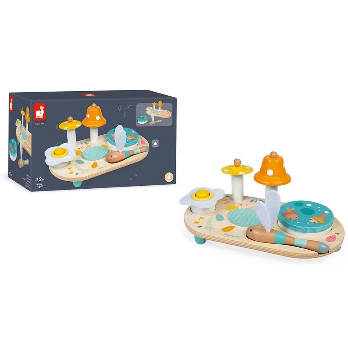 Baby will love to play with this pretty wooden musical table composed of a cymbal, a bell, a scraper, a pouet-pouet and a removable tambourine. The drumstick is a funny and pretty dragonfly with felt wings! A beautiful wooden toy to awaken your child to music in a ludic way.