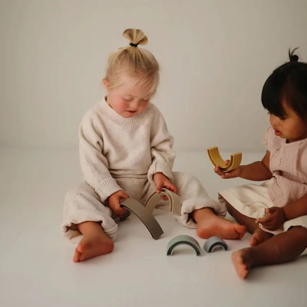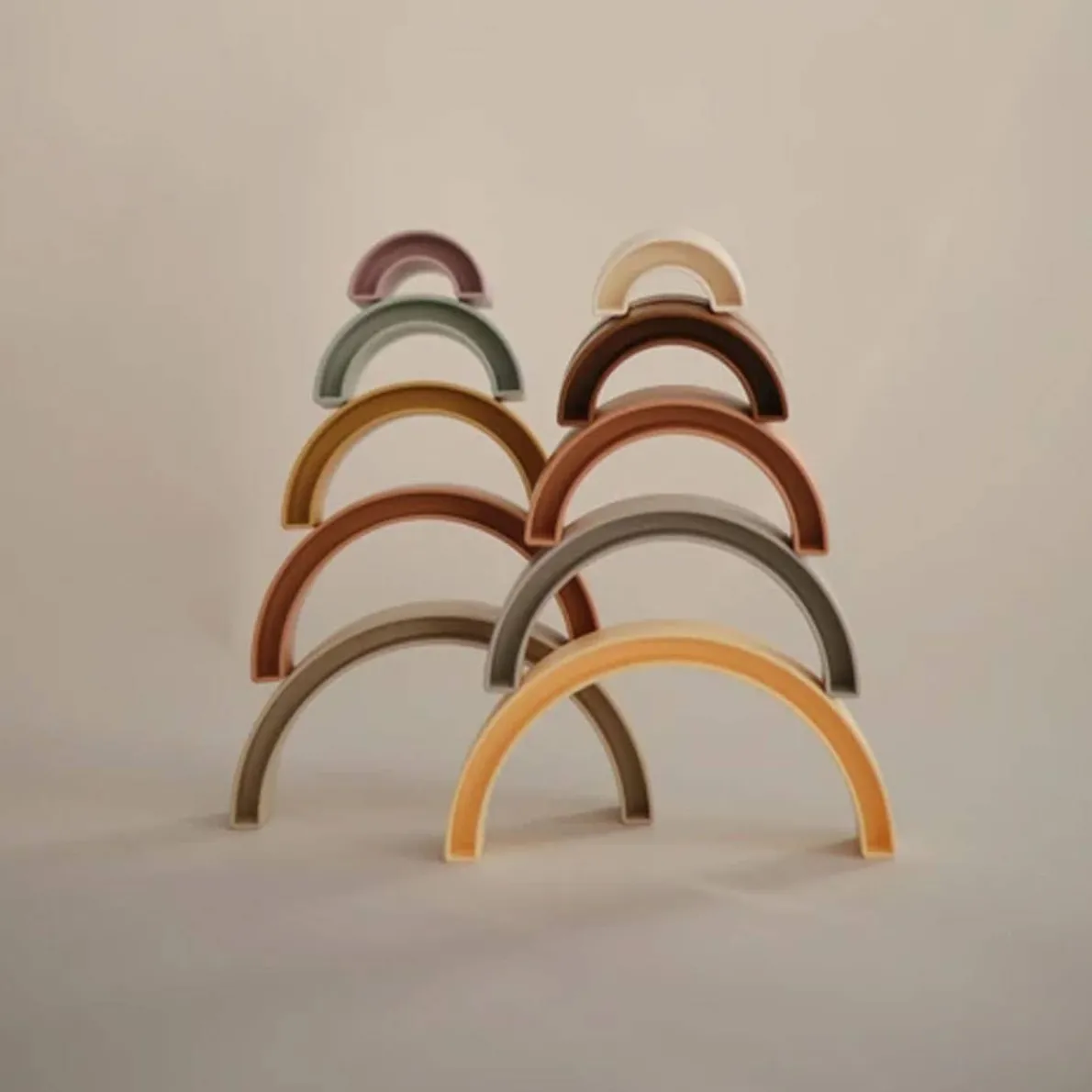 From Mushie Danish hygge collection comes this playful rainbow stacker, inspired by the rainbow skywalk in Aarhus, Denmark. Little ones will sort, stack and play with this beautiful set, all while learning with soft colors and developing their fine motor skills.