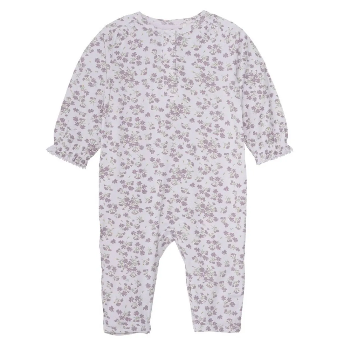 Cute all-over print romper from FIXONI. The suit has long sleeves with feet. The suit closes at the front with snaps and between the legs.