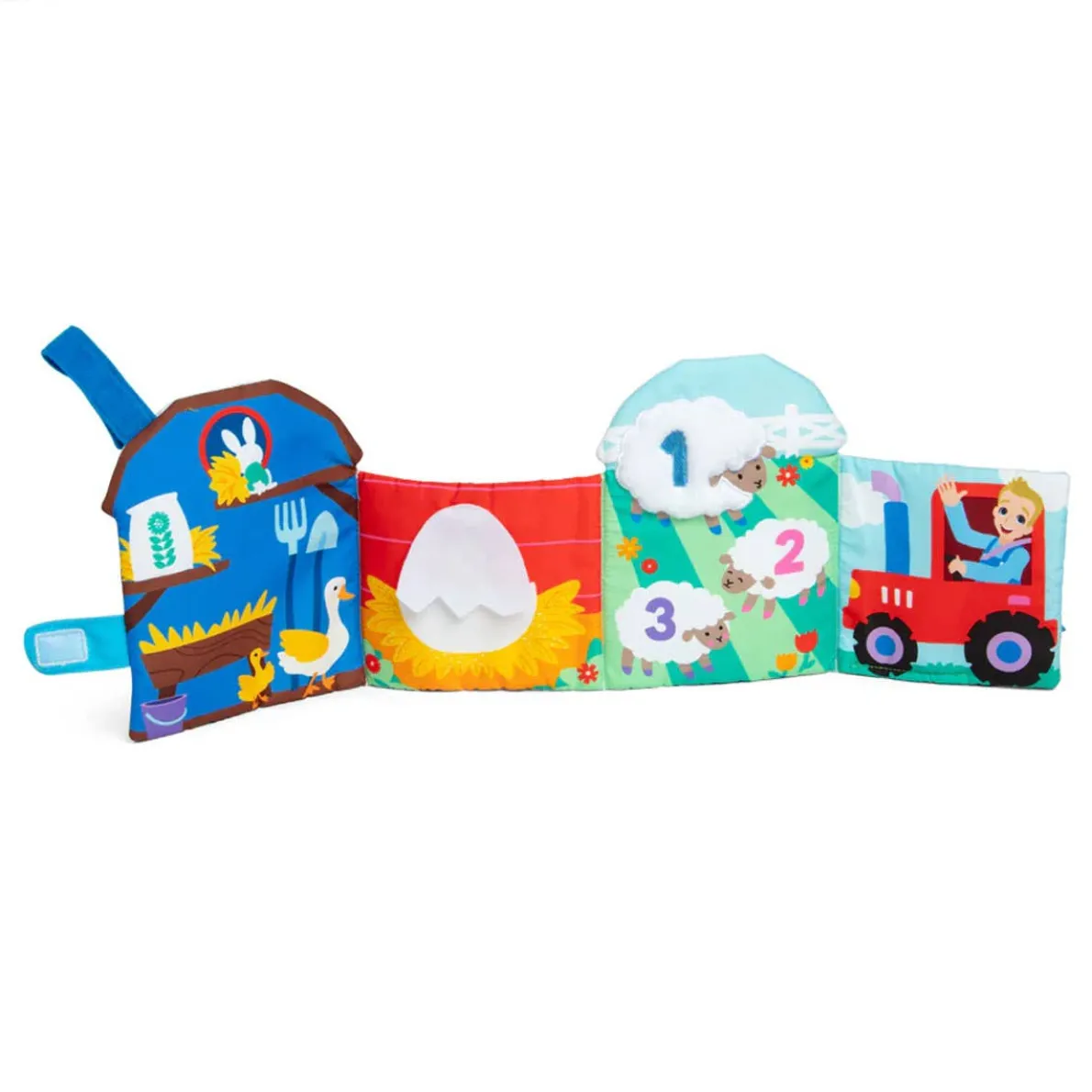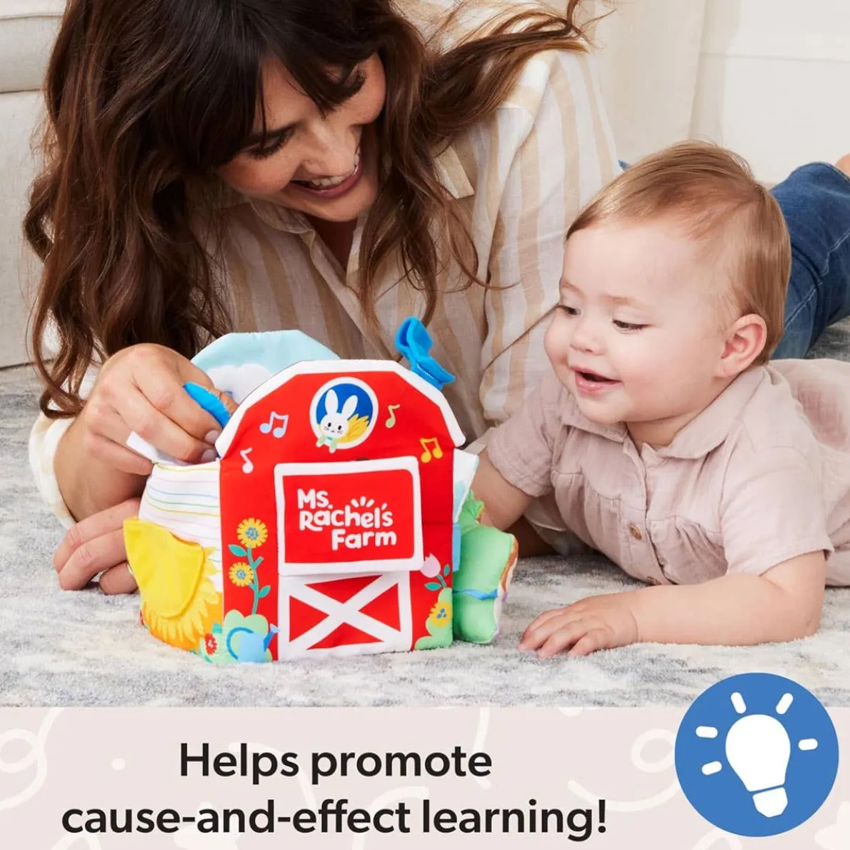 - OFFICIAL MS. RACHEL SENSORY TOYS: Soft, farm-themed baby developmental play set with 8 animal environments, a plush toy cow, teether, baby-safe mirror, colorful ribbons, and peek-a-boo crinkle flaps.