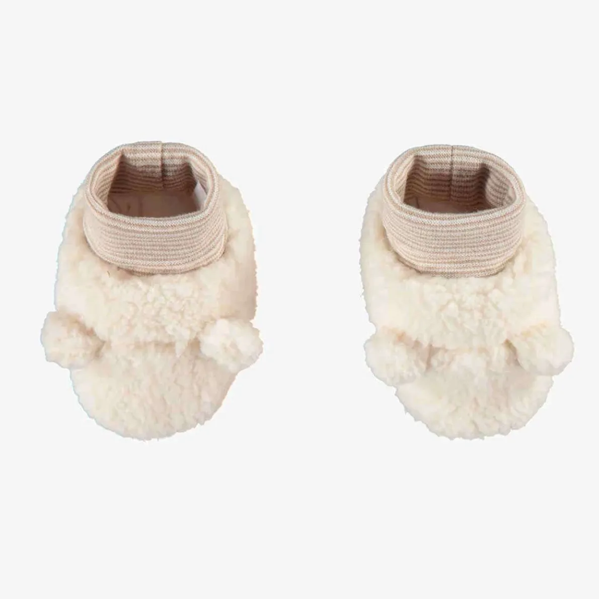 Keep your baby’s feet warm and cozy with these soft sherpa slippers. The stretchy cotton jersey ankles provide a snug fit and a stylish look. Their neutral color makes them easy to pair with any outfit.
